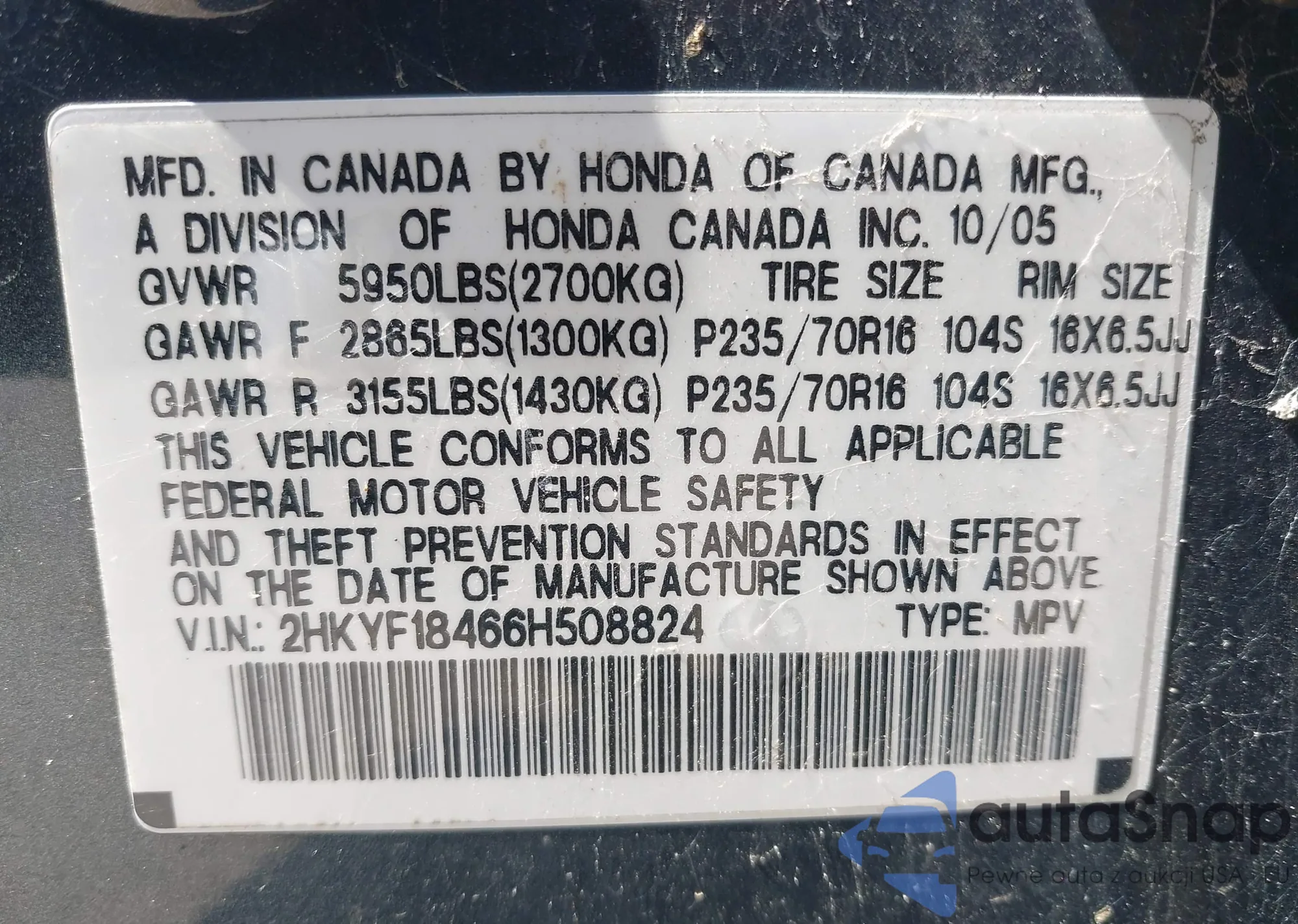 LOT: 42251893 VIN: 2HKYF18466H508824