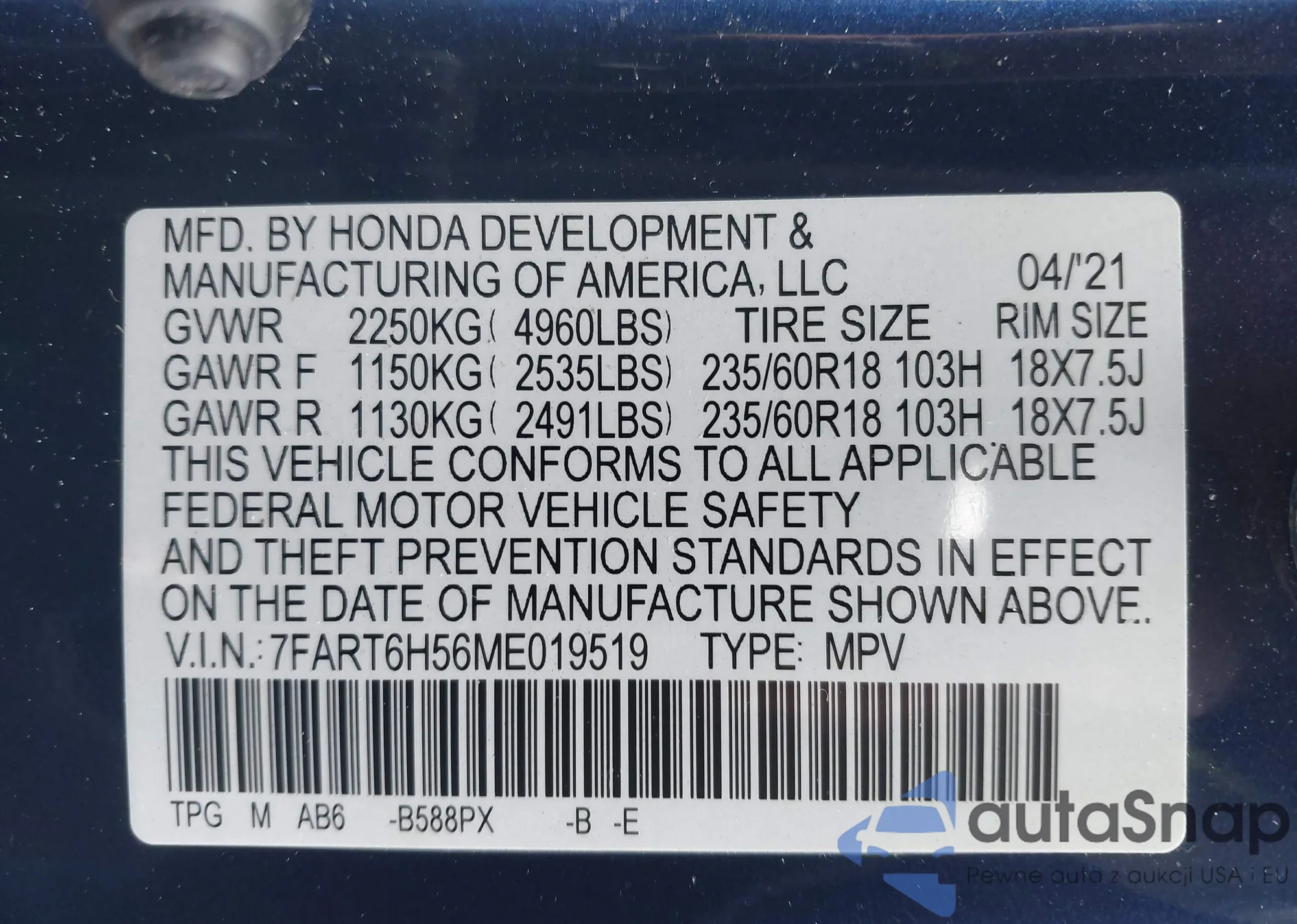 • VIN 7FART6H56ME019519
