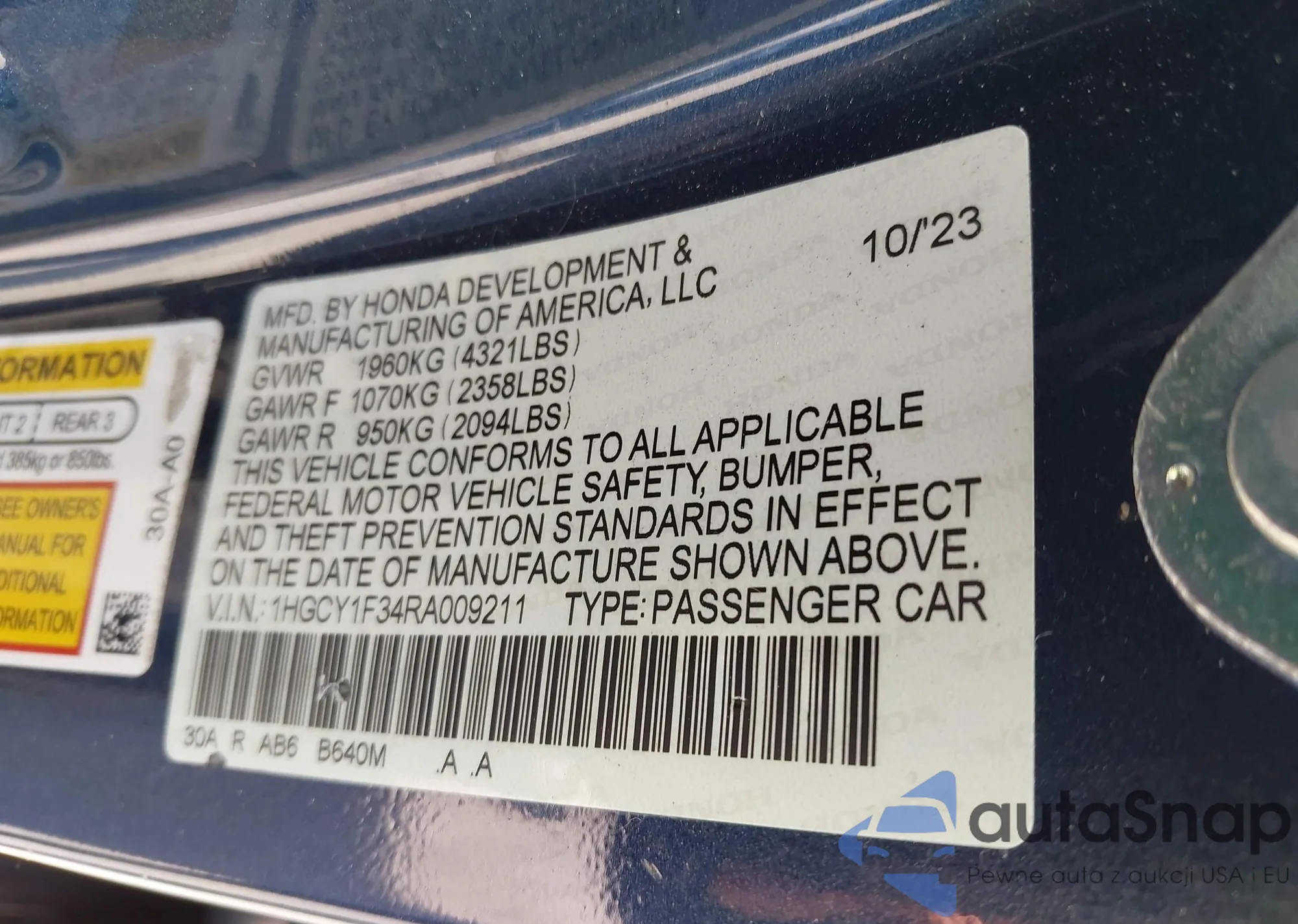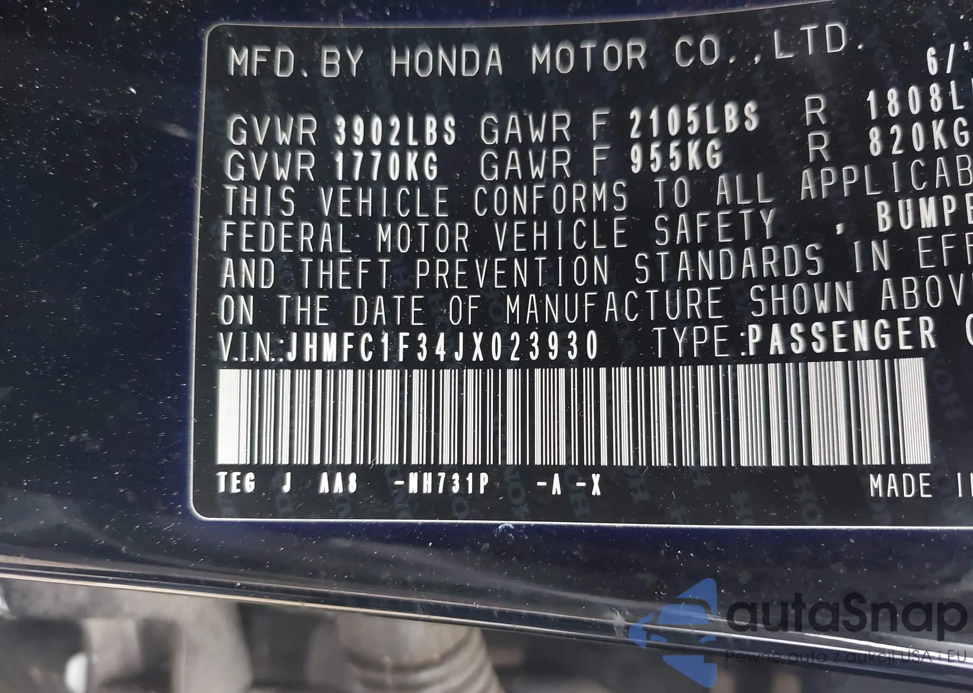 LOT: 41939026 VIN: JHMFC1F34JX023930