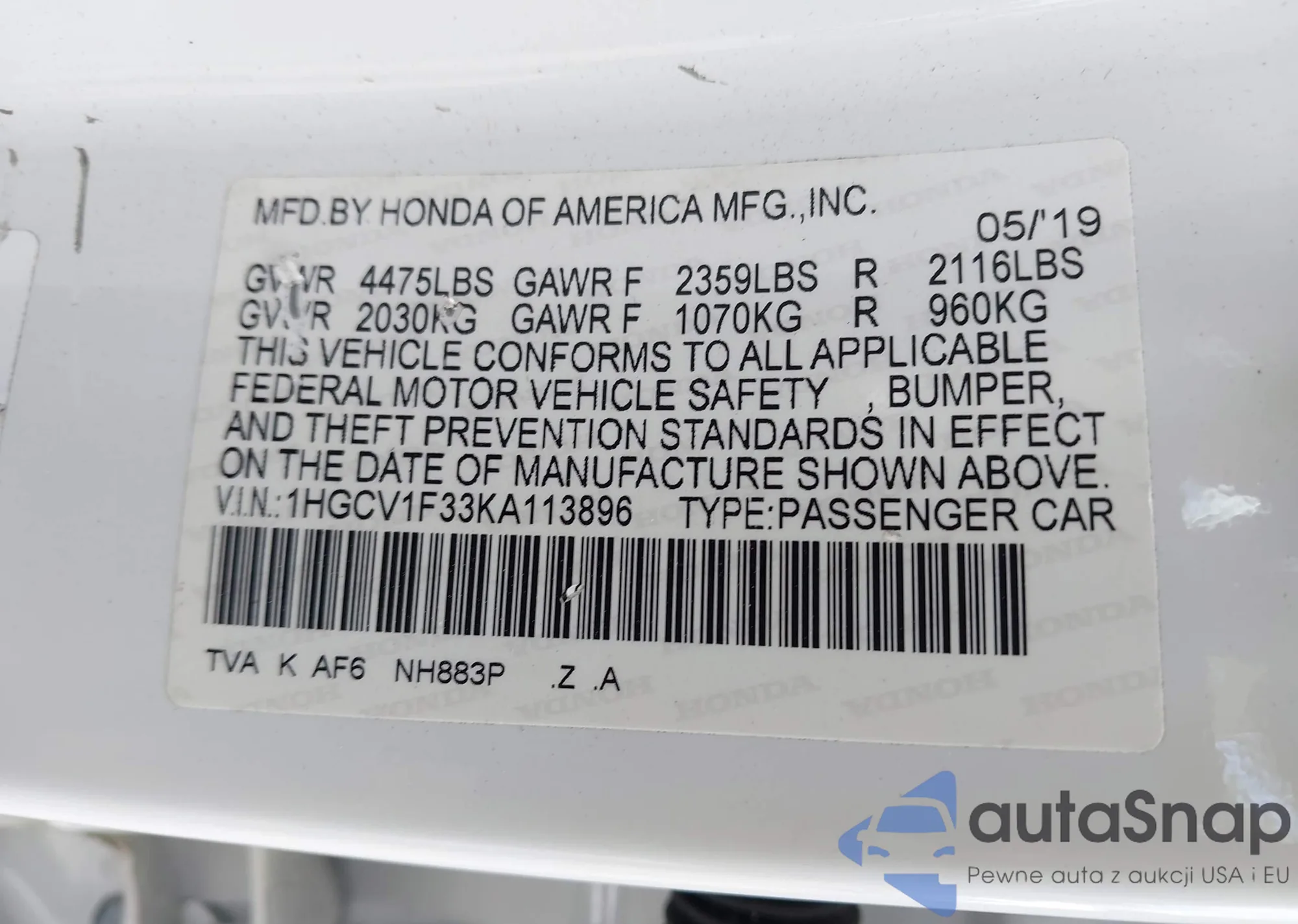 • VIN 1HGCV1F33KA113896