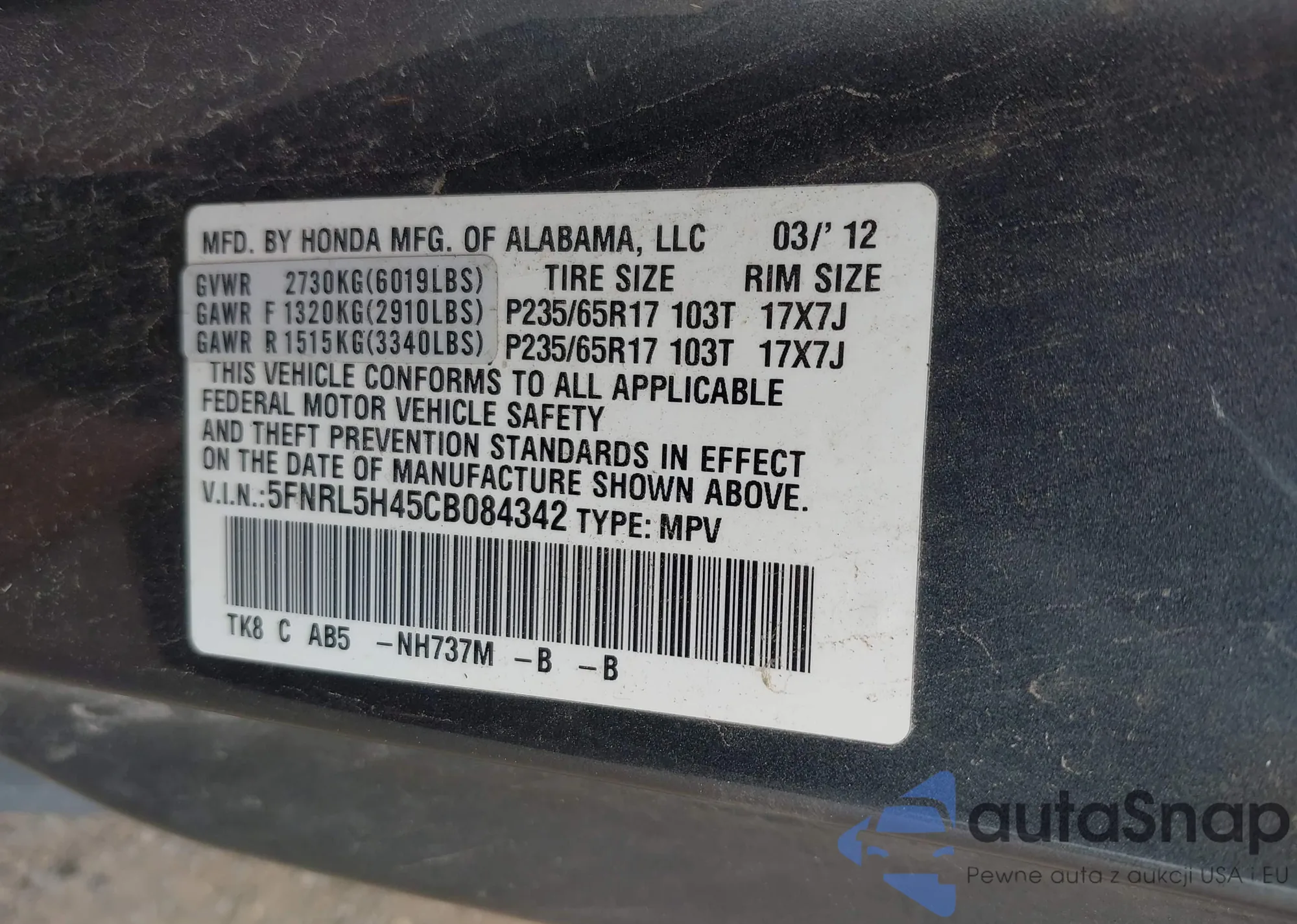 • VIN 5FNRL5H45CB084342
