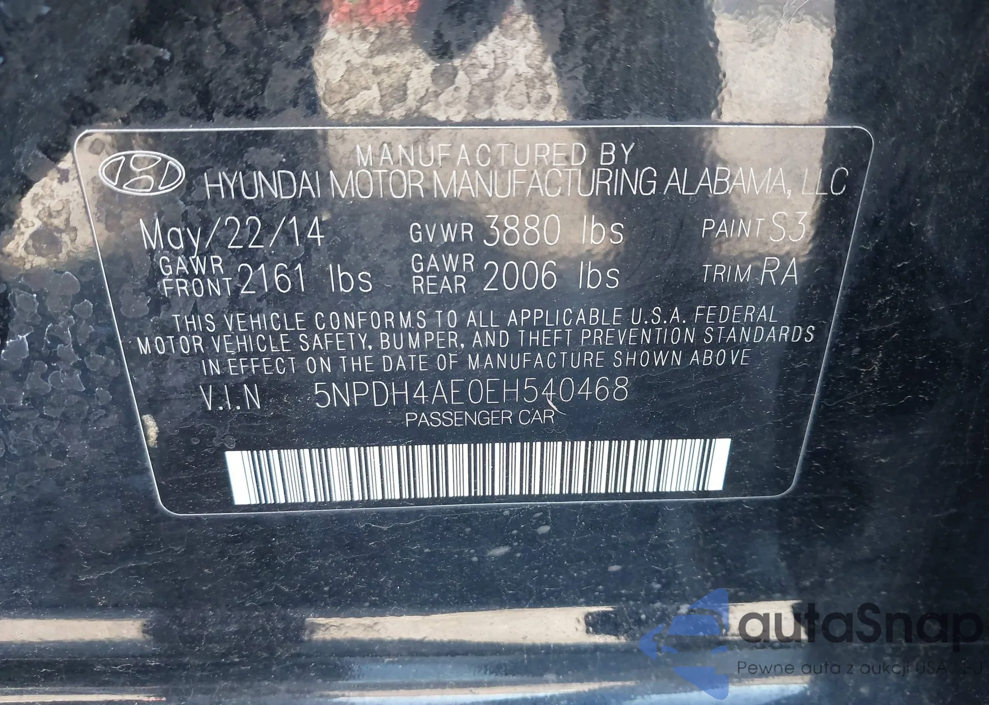 LOT: 42388330 VIN: 5NPDH4AE0EH540468