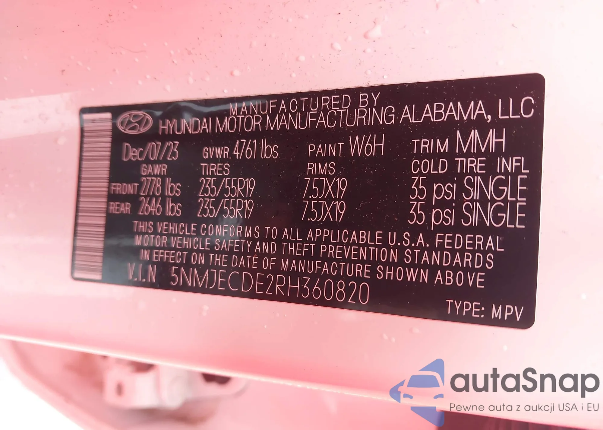 • VIN 5NMJECDE2RH360820