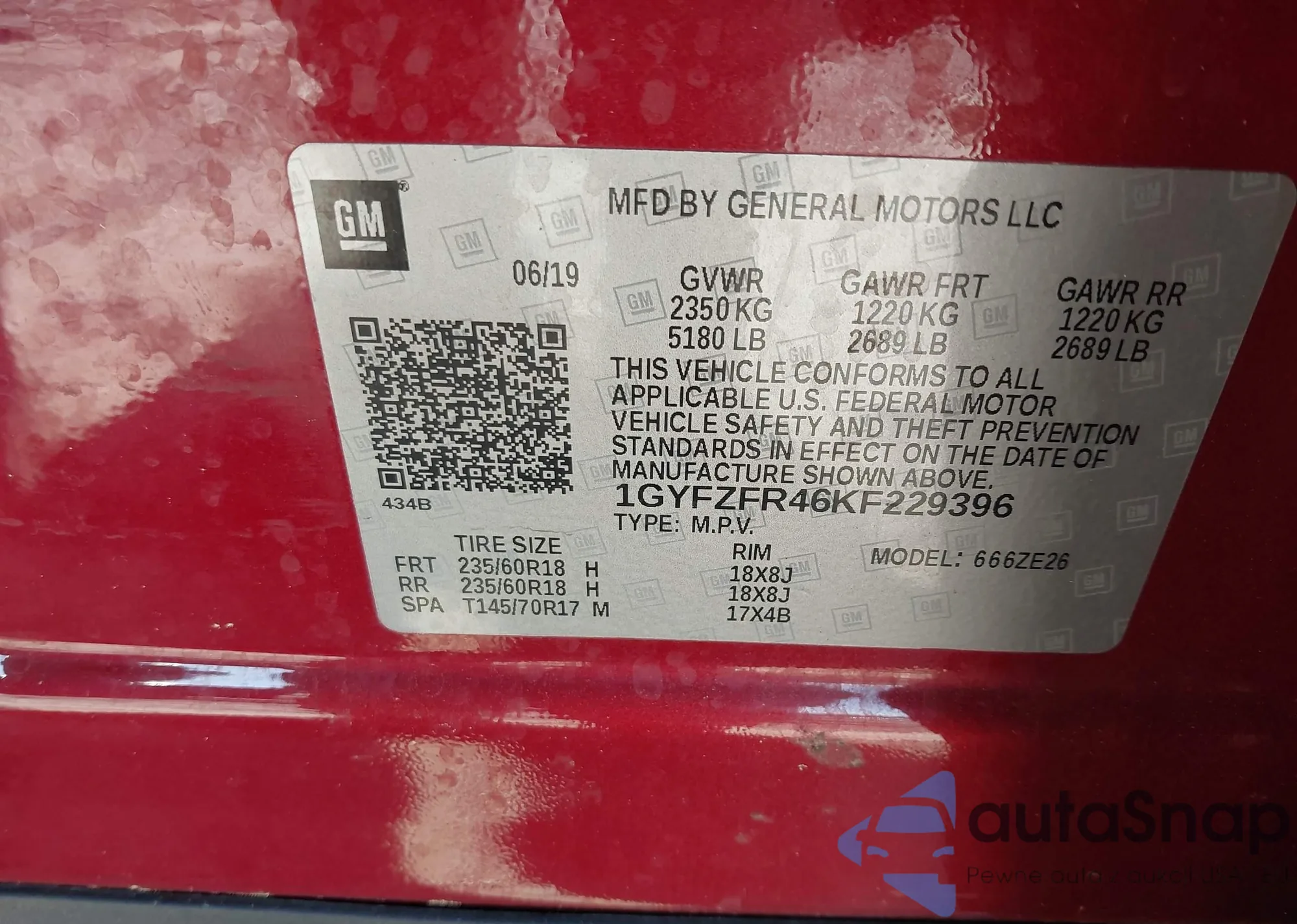 • VIN 1GYFZFR46KF229396