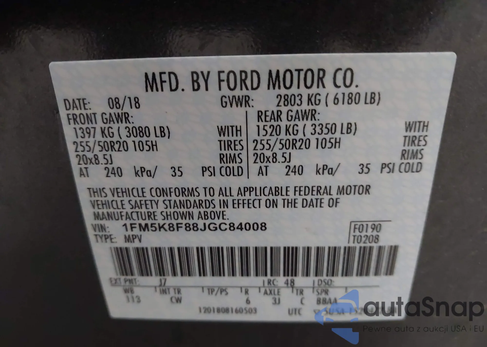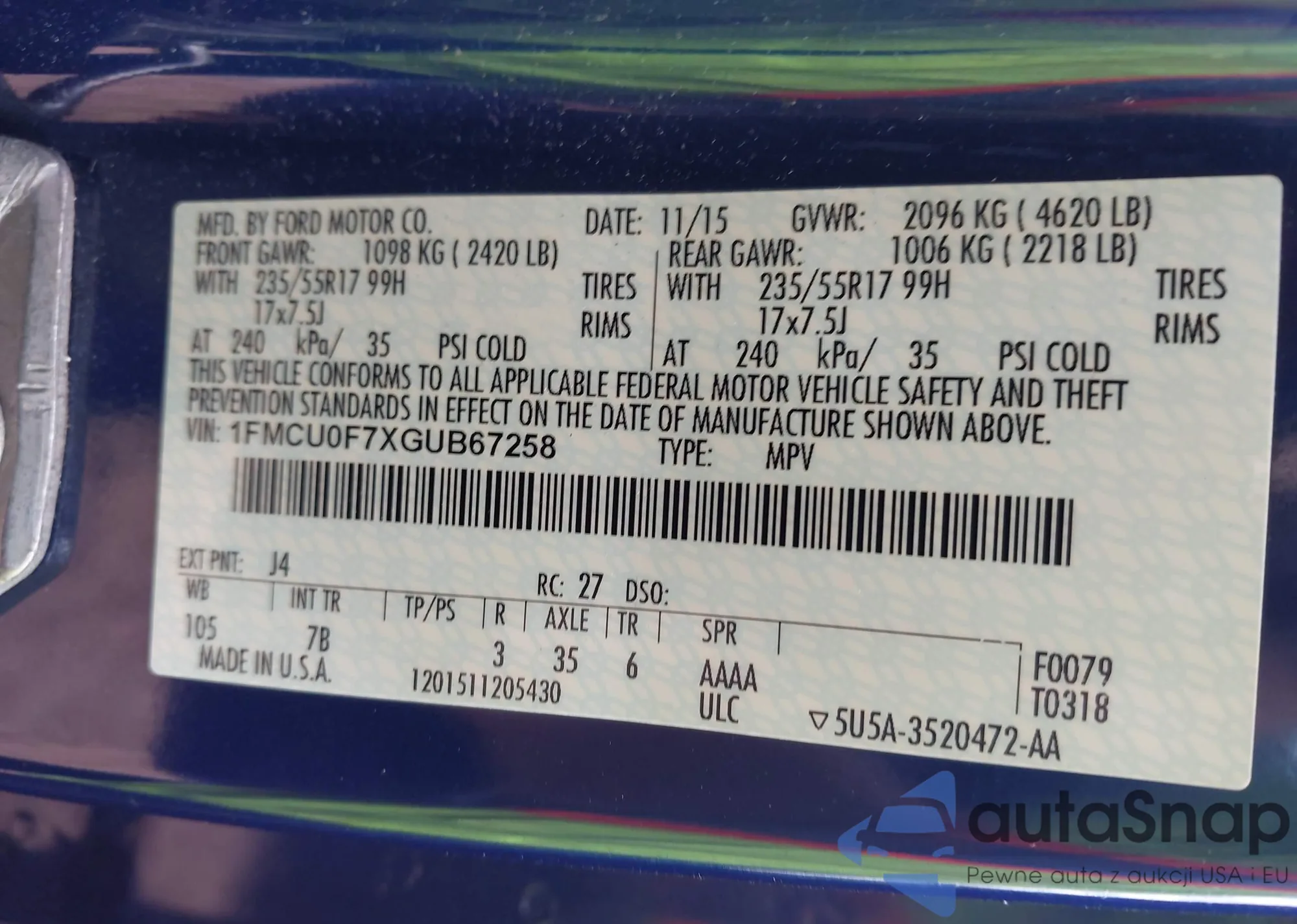 LOT: 42254153 VIN: 1FMCU0J90JUC94357