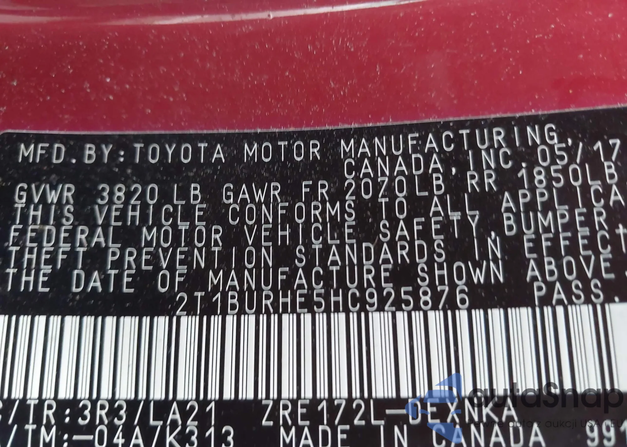 LOT: 42303025 VIN: 2T1BURHE5HC925876