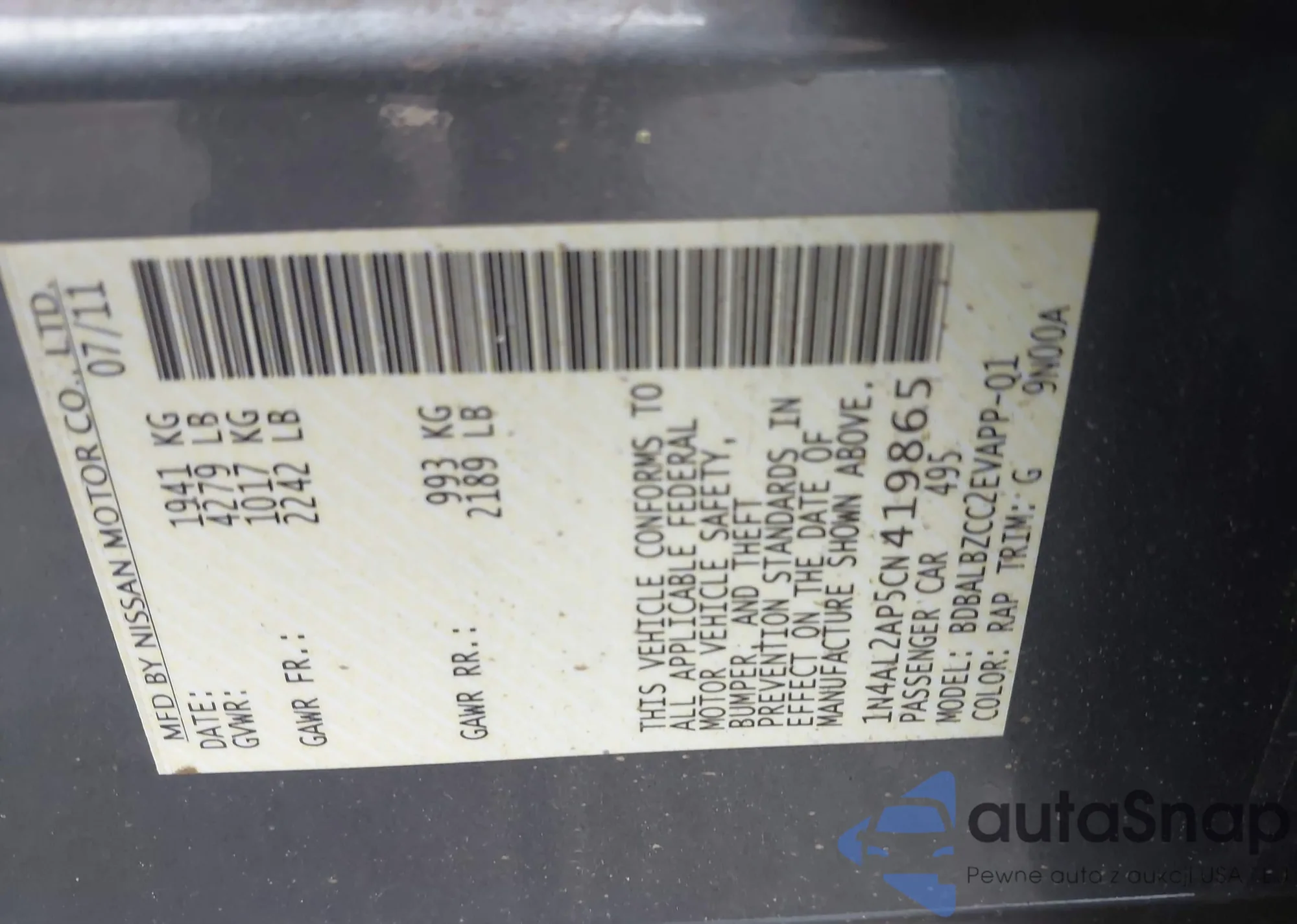 LOT: 42286394 VIN: 1N4AL2AP5CN419865