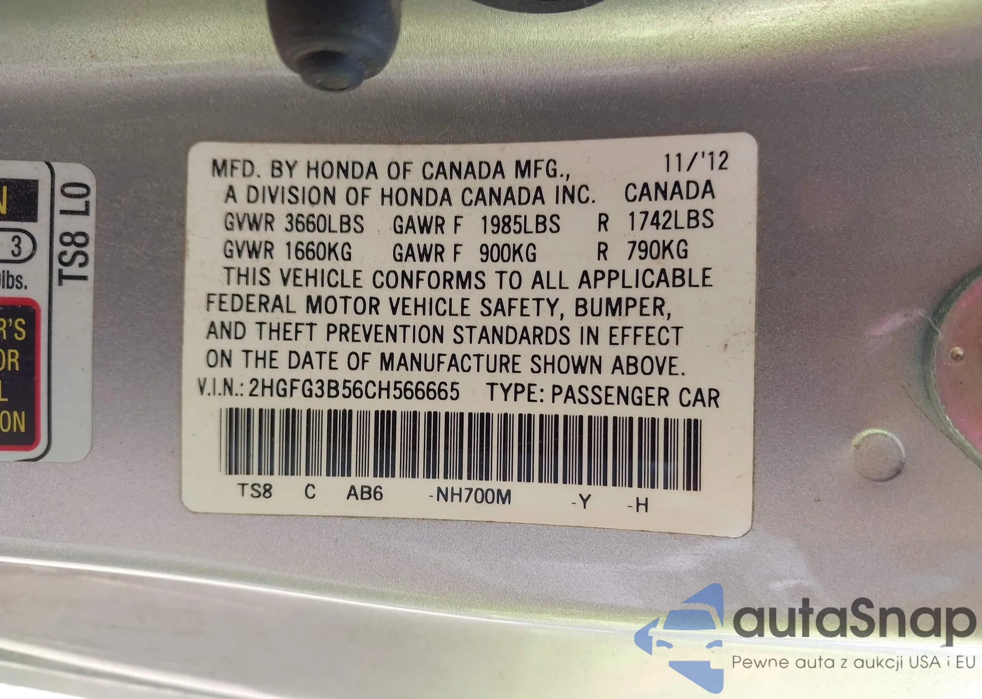 • VIN 2HGFG3B56CH566665