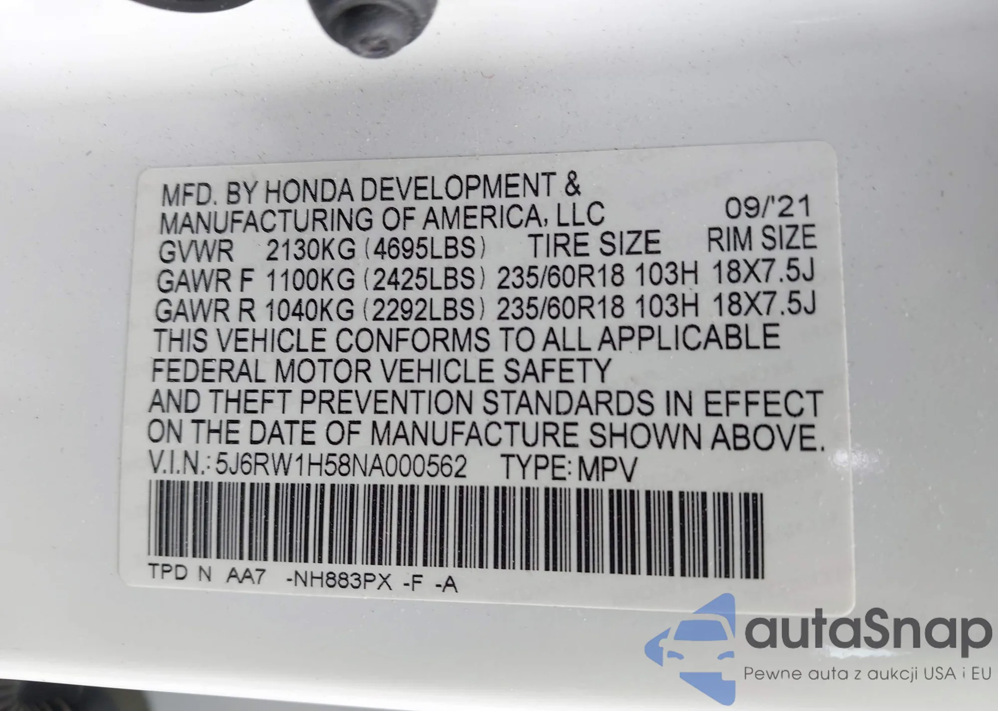• VIN 5J6RW1H58NA000562