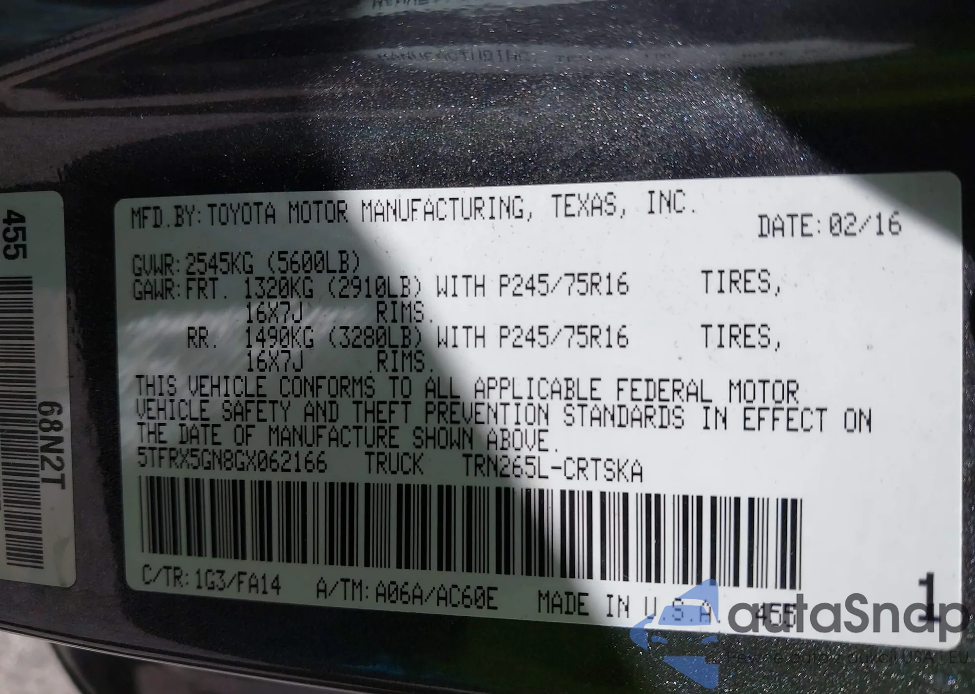 LOT: 42257541 VIN: 5TFRX5GN8GX062166