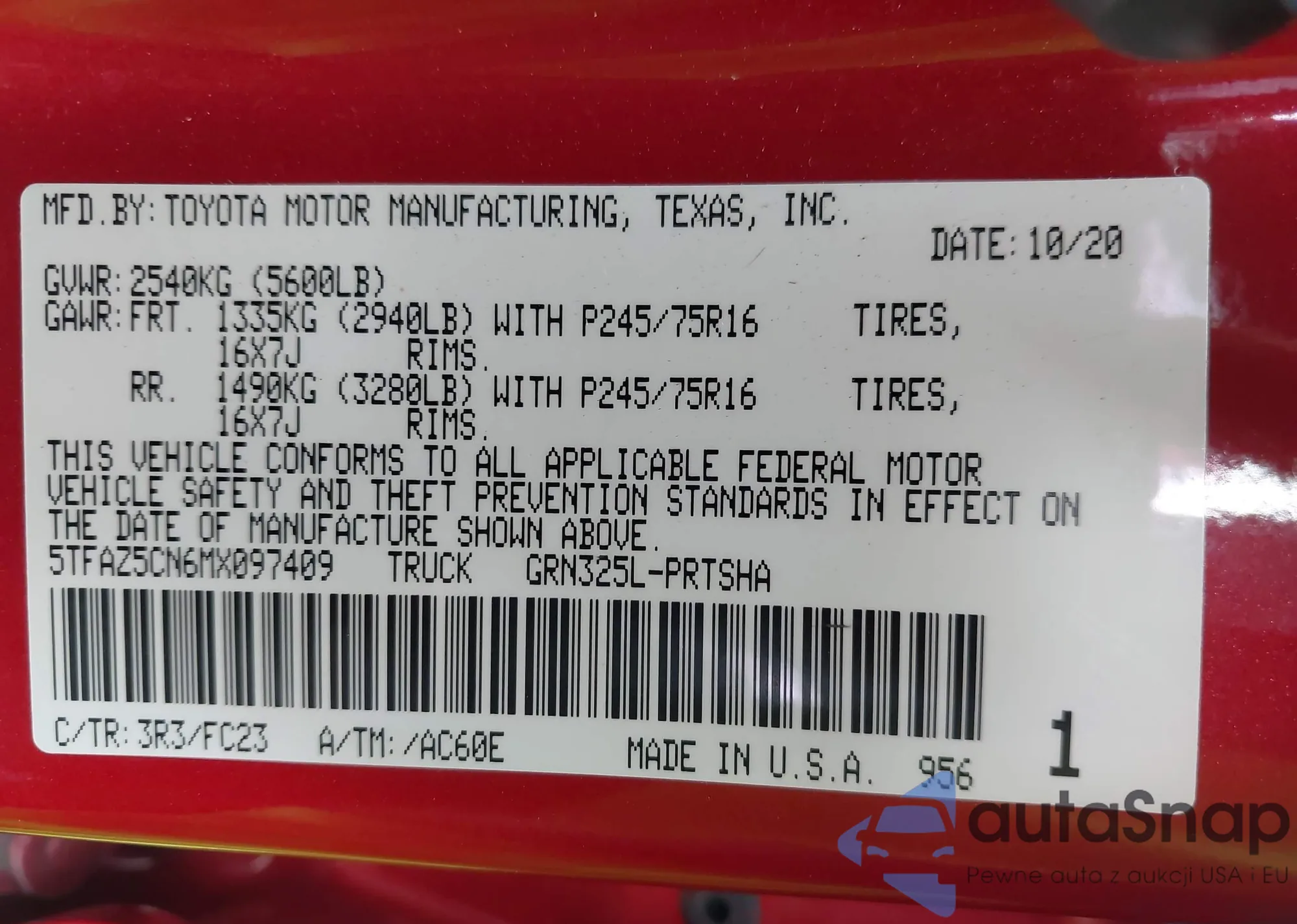 • VIN 5TFAZ5CN6MX097409