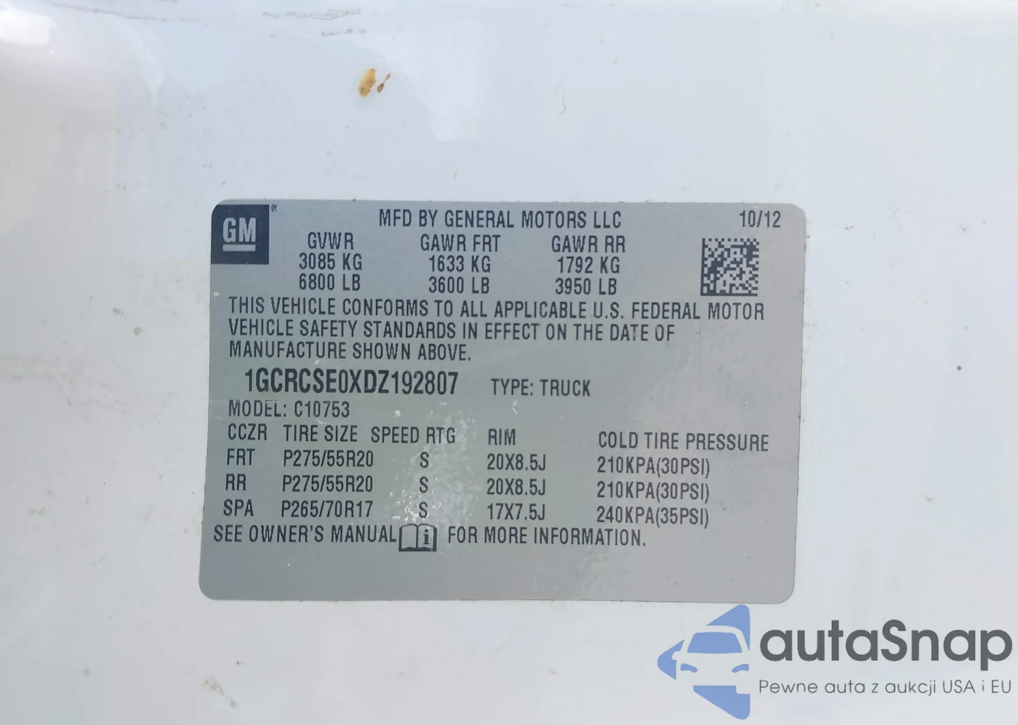 LOT: 40135034 VIN: 1GCRCSE0XDZ192807