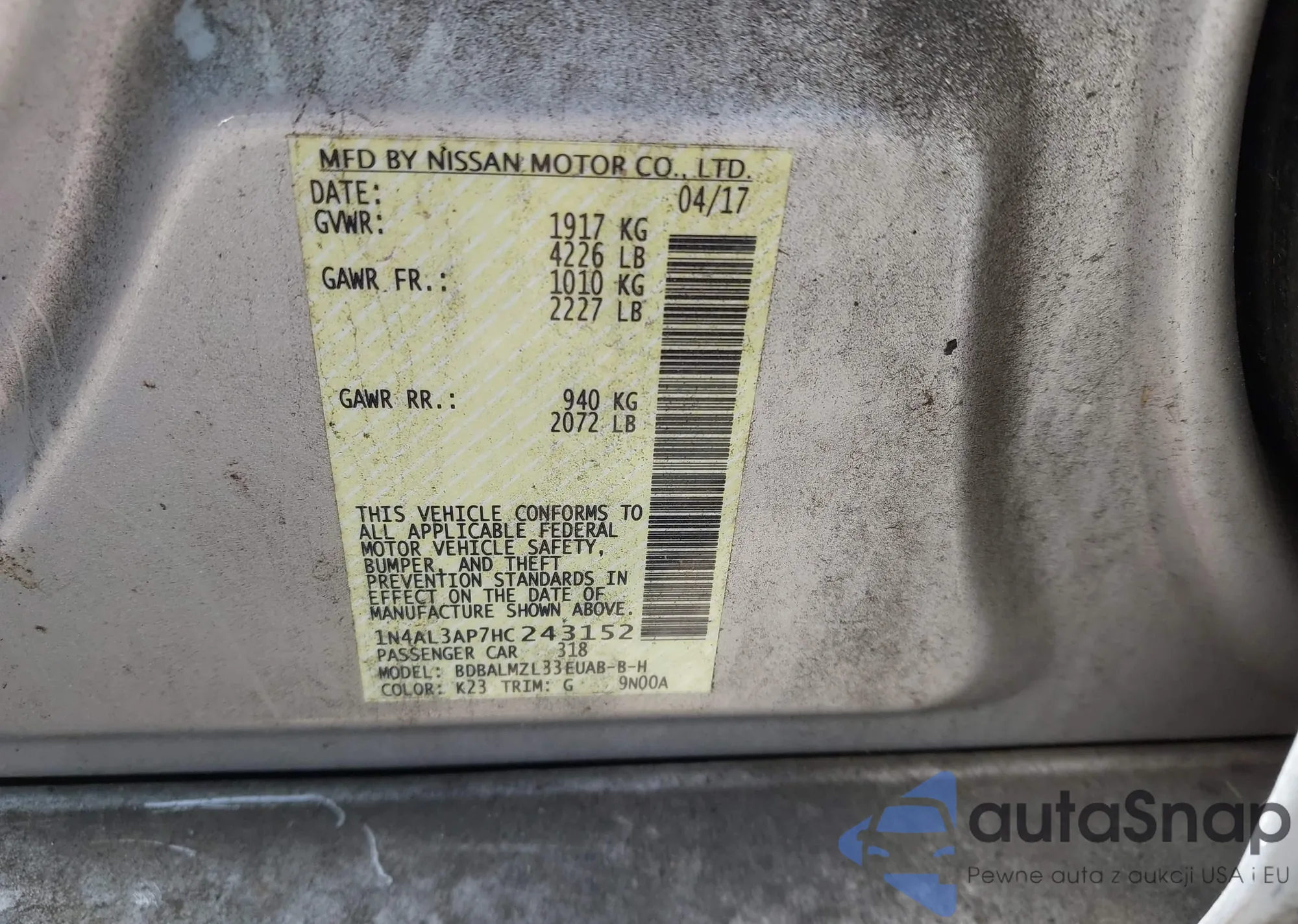 • VIN 1N4AL3AP7HC243152