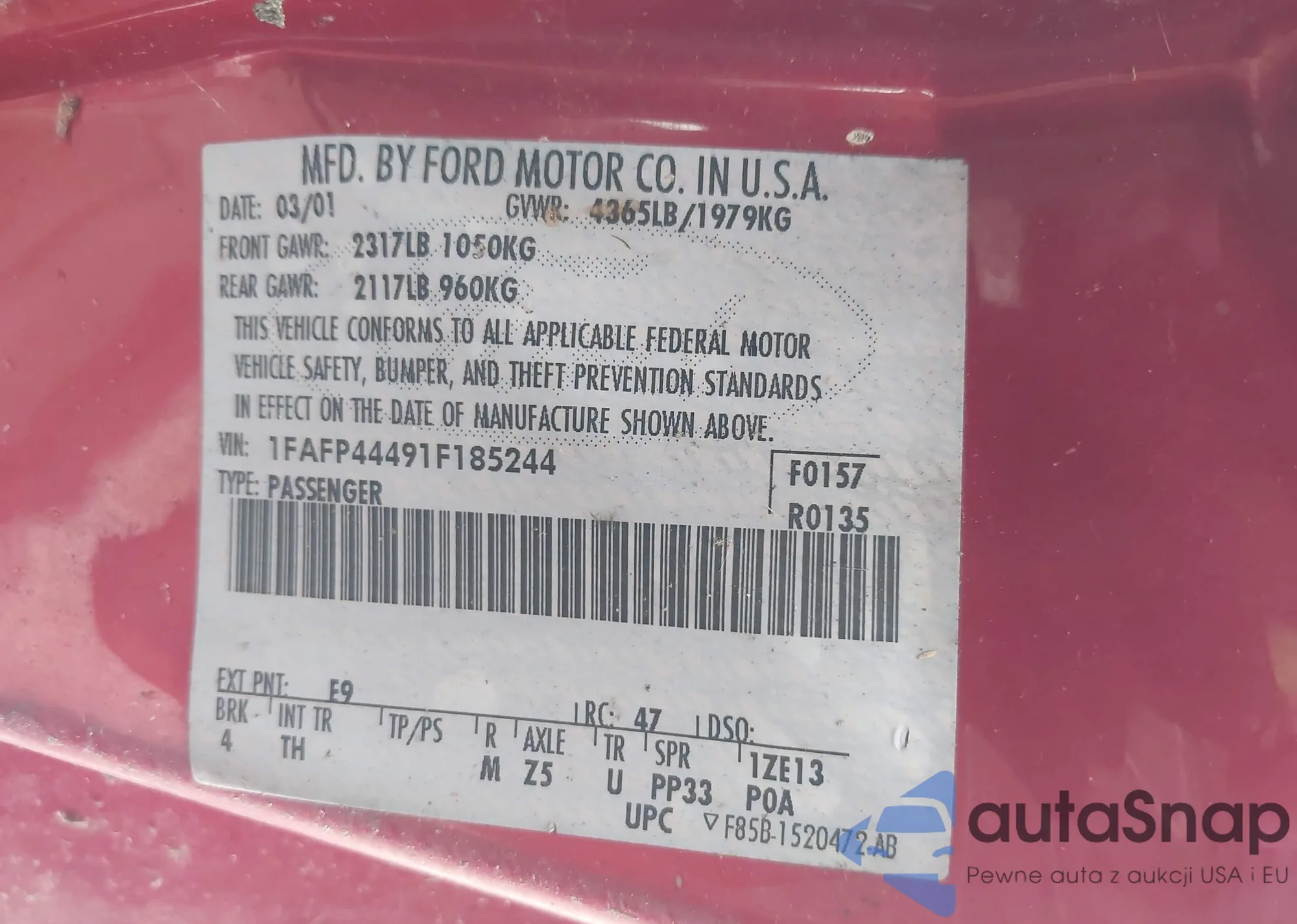 LOT: 42332315 VIN: 3FA6P0T91HR197908