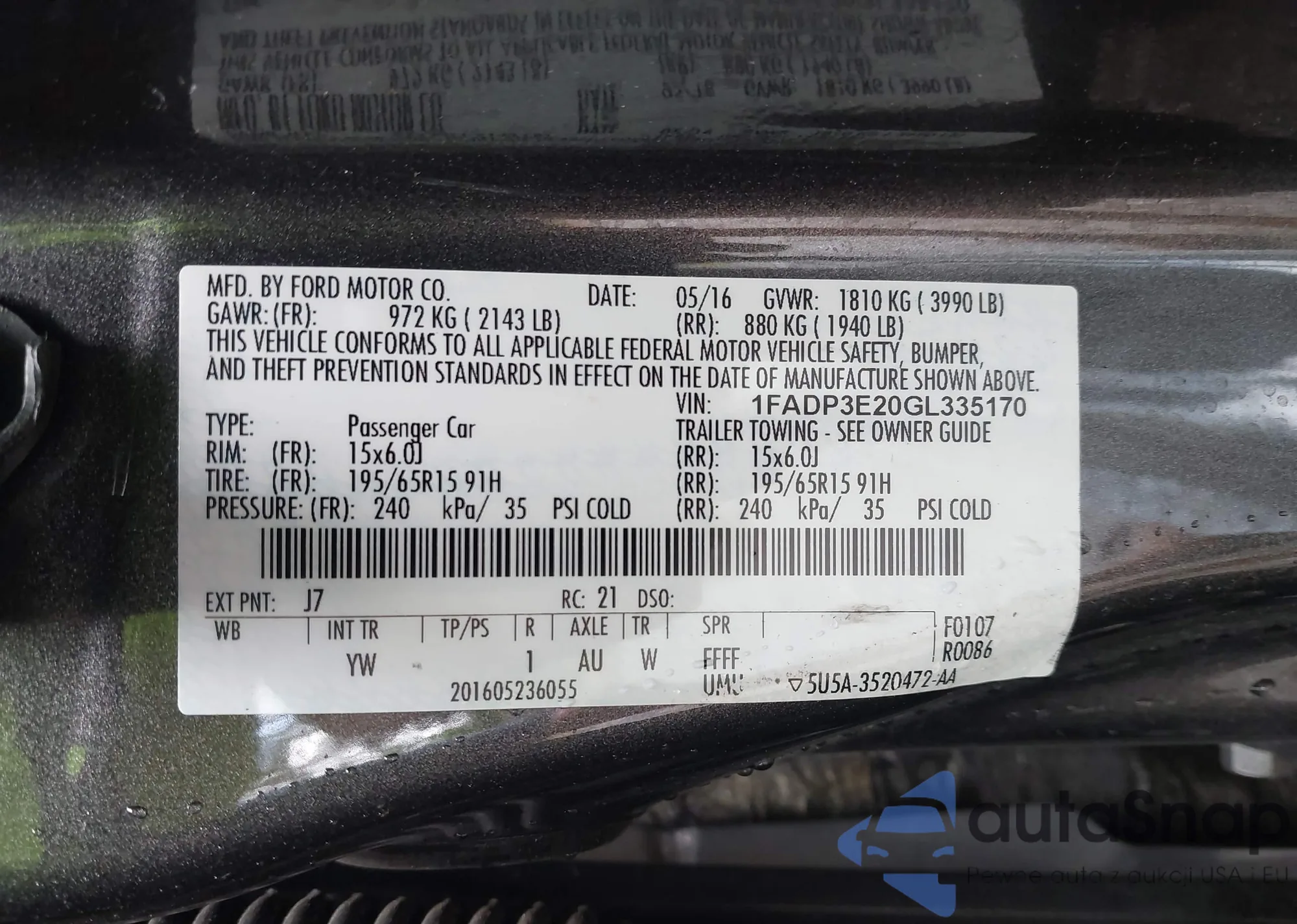 LOT: 42355552 VIN: 1FADP3F24HL244600