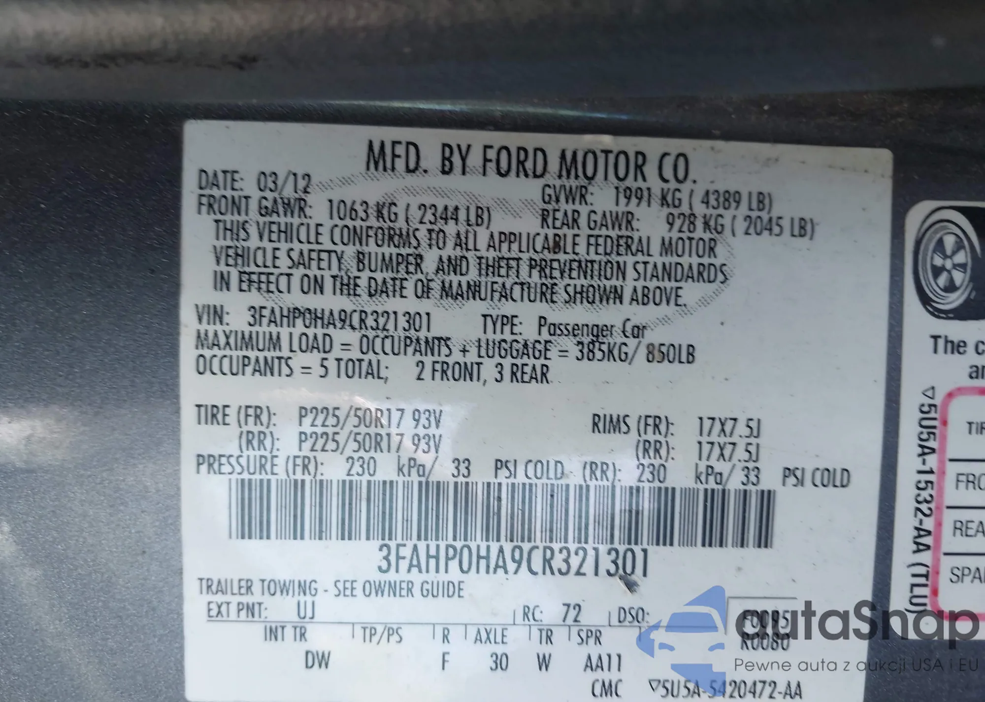 • VIN 3FAHP0HA9CR321301