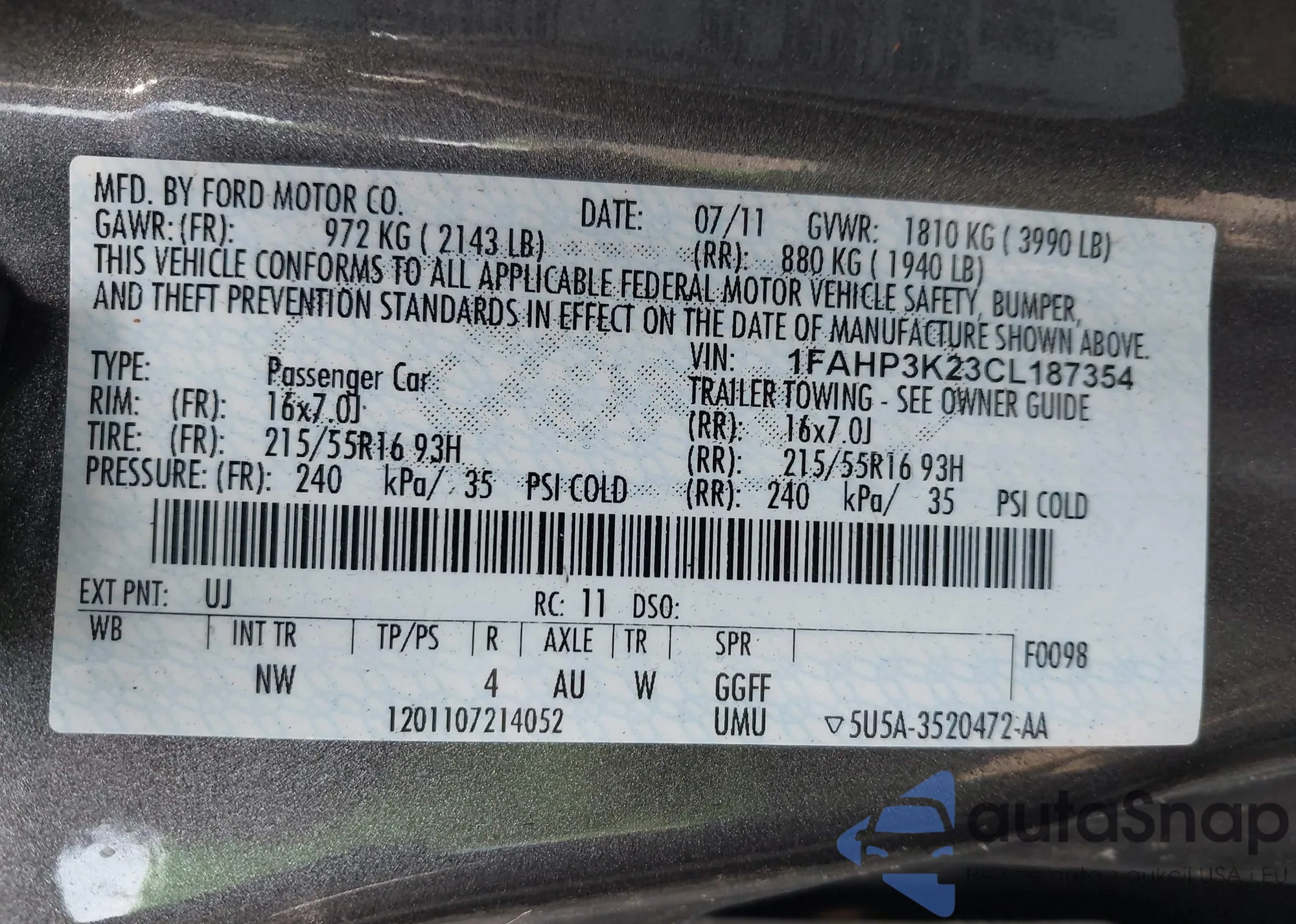 • VIN 1FAHP3K23CL187354