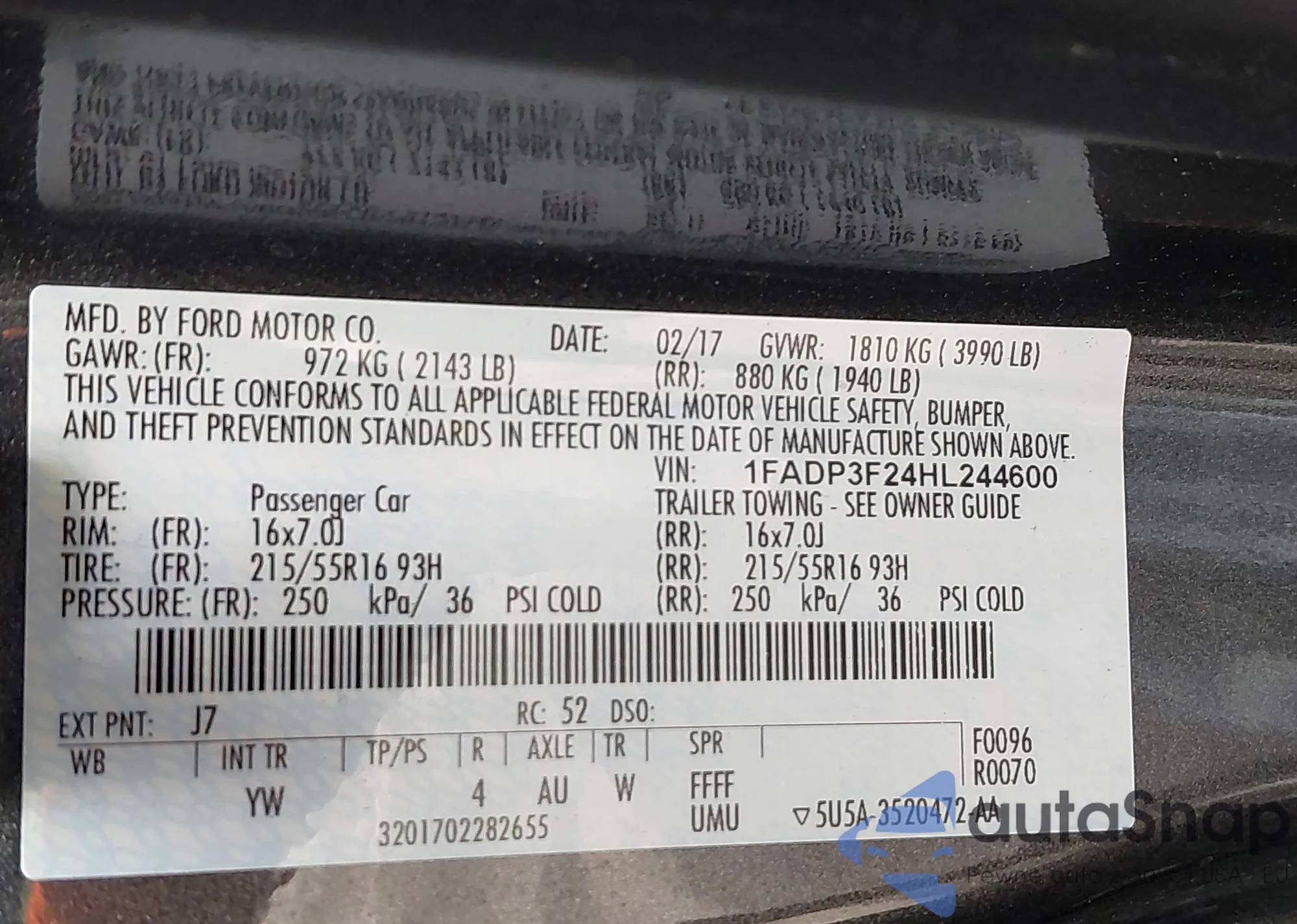 • VIN 1FADP3F24HL244600