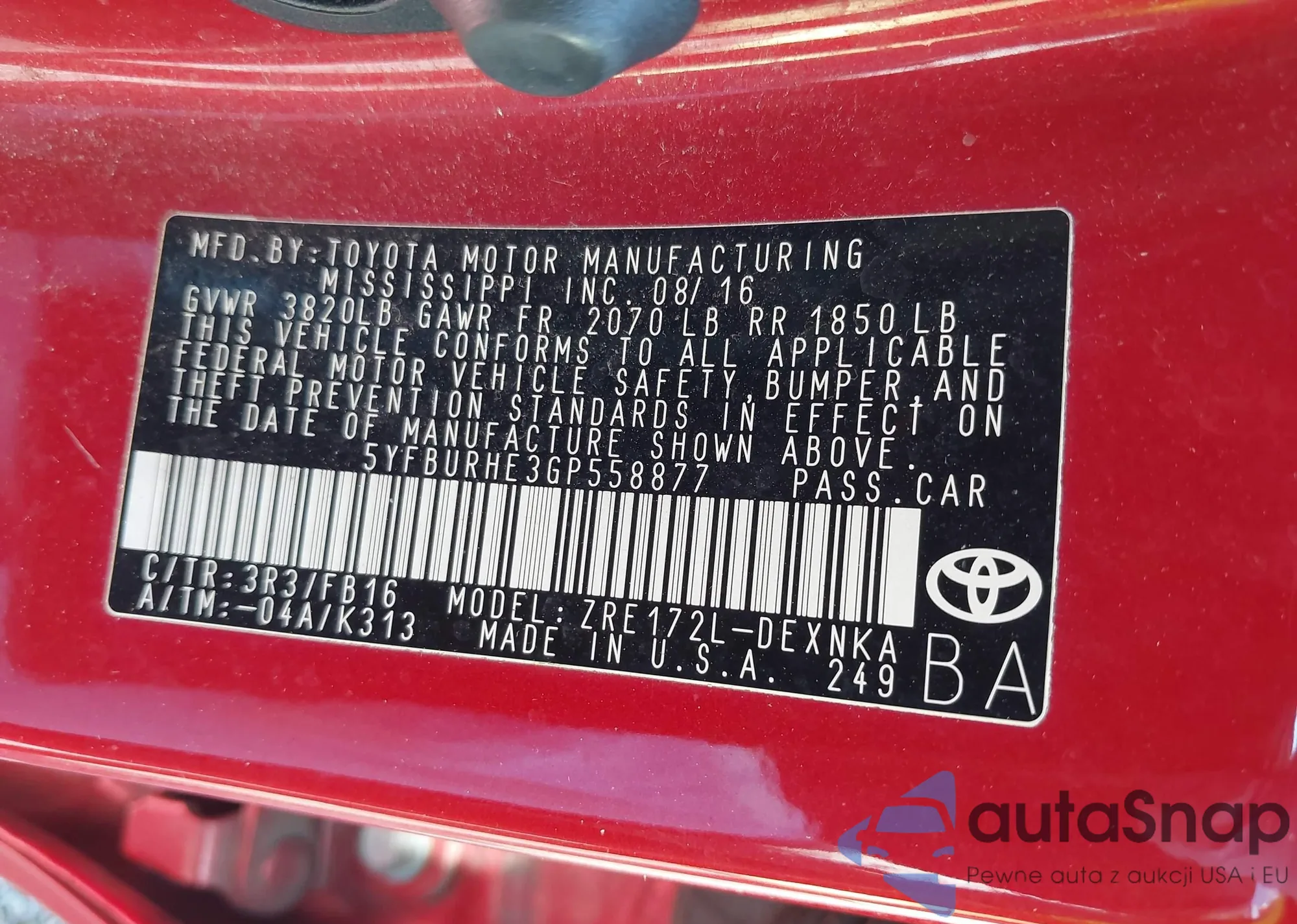 • VIN 5YFBURHE3GP558877