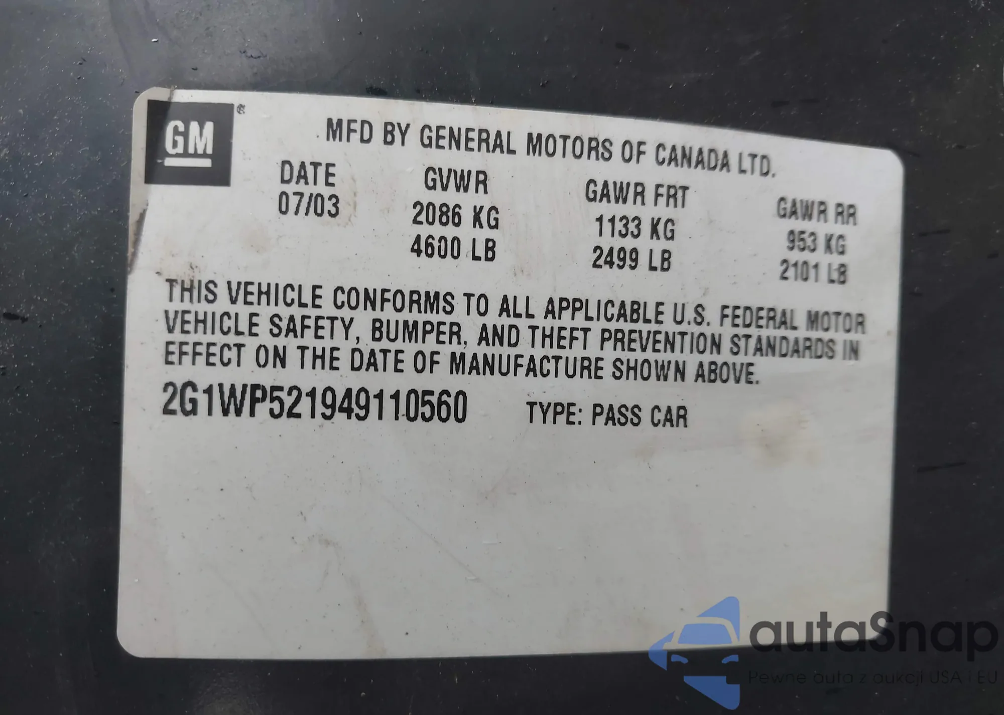 • VIN 2G1WP521949110560