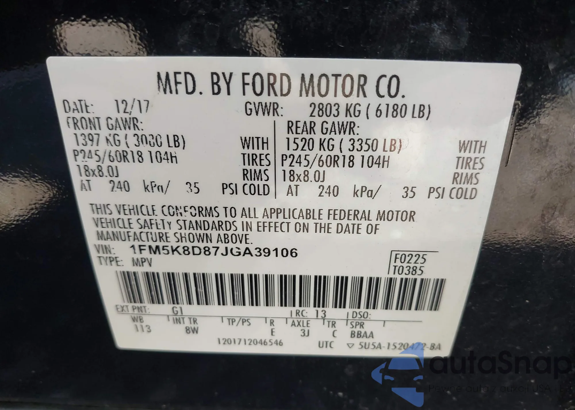 LOT: 41863640 VIN: 1FM5K8D87JGA39106