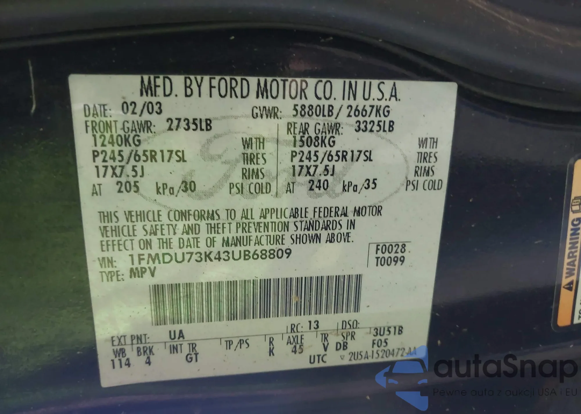 • VIN 1FMDU73K43UB68809