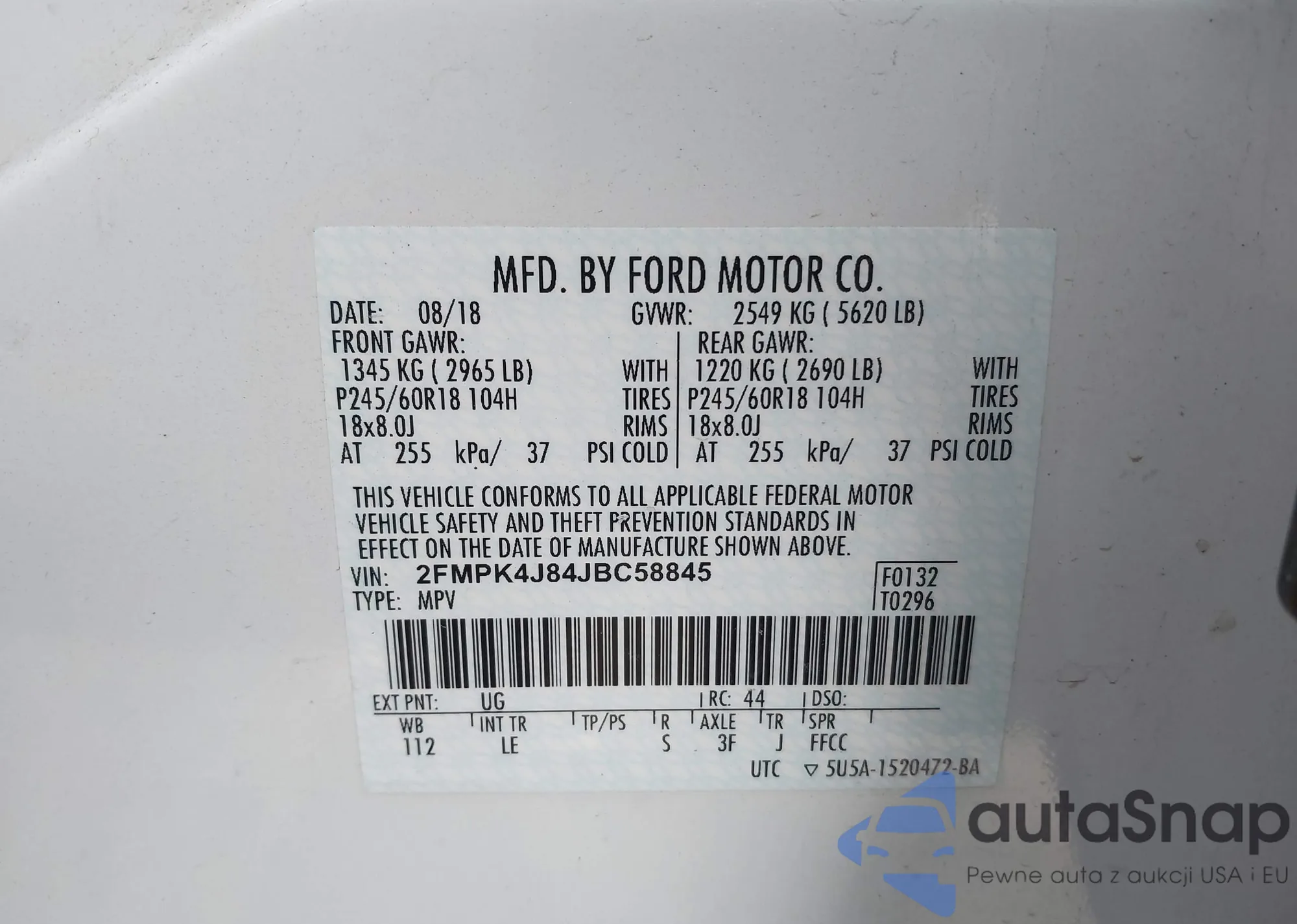 LOT: 41822935 VIN: 2FMPK4J84JBC58845