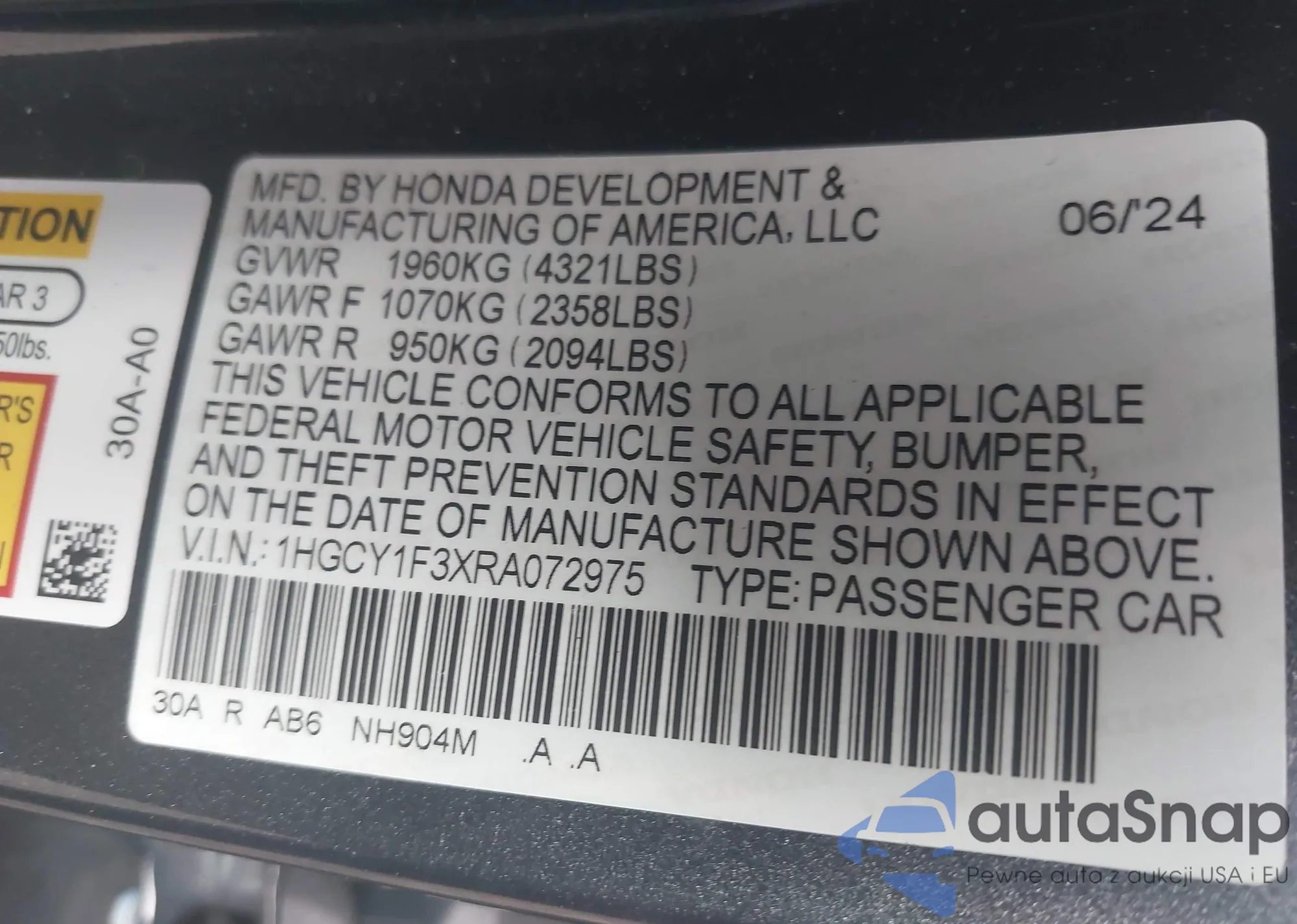 • VIN 1HGCY1F3XRA072975
