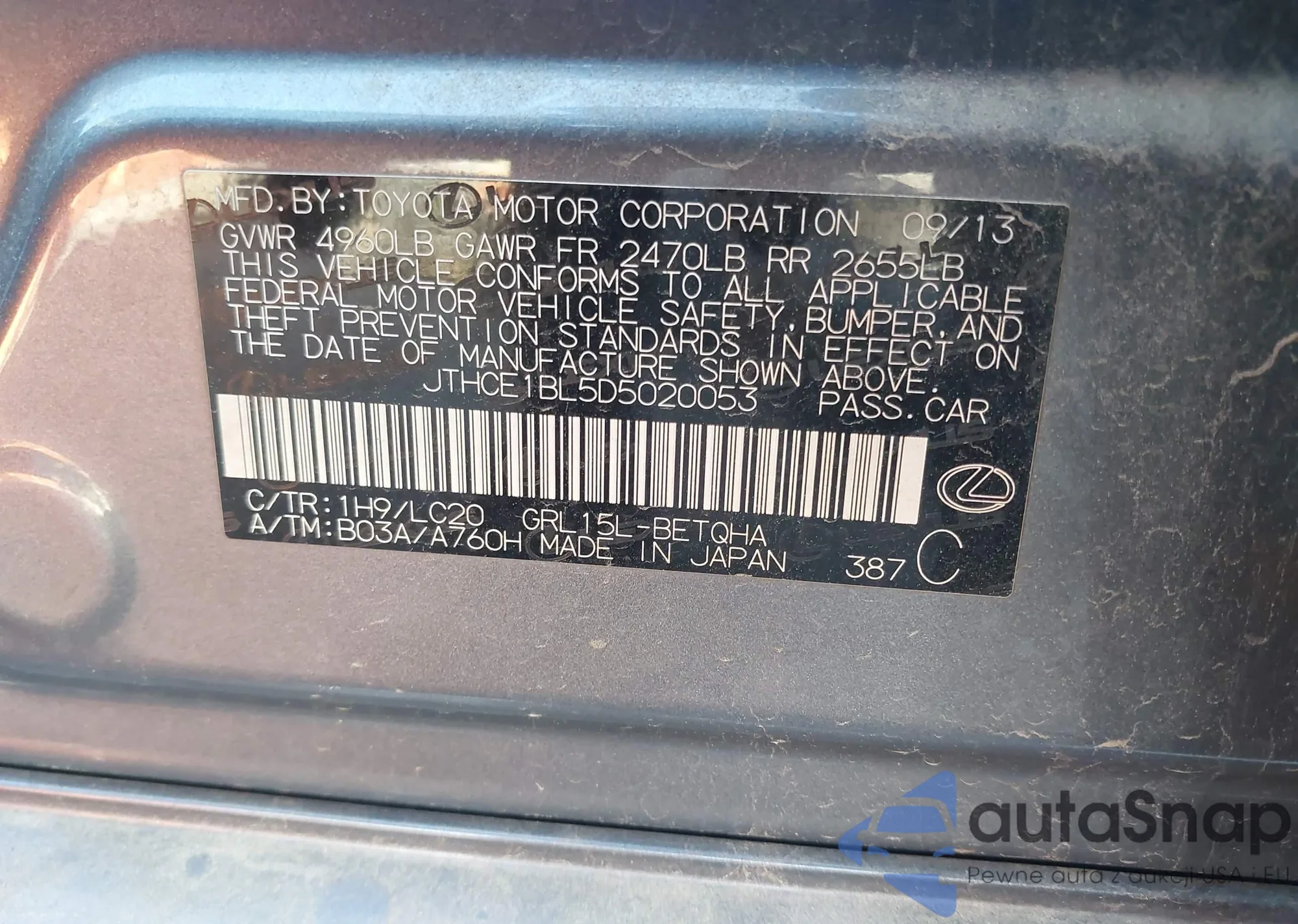 • VIN JTHCE1BL5D5020053