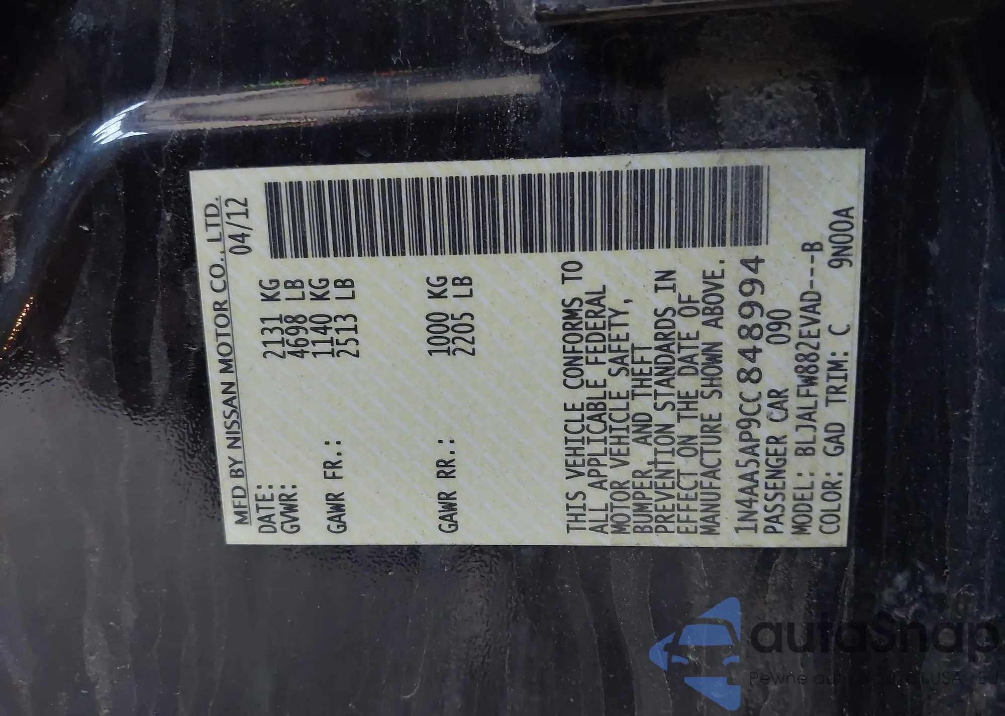 • VIN 1N4AA5AP9CC848994