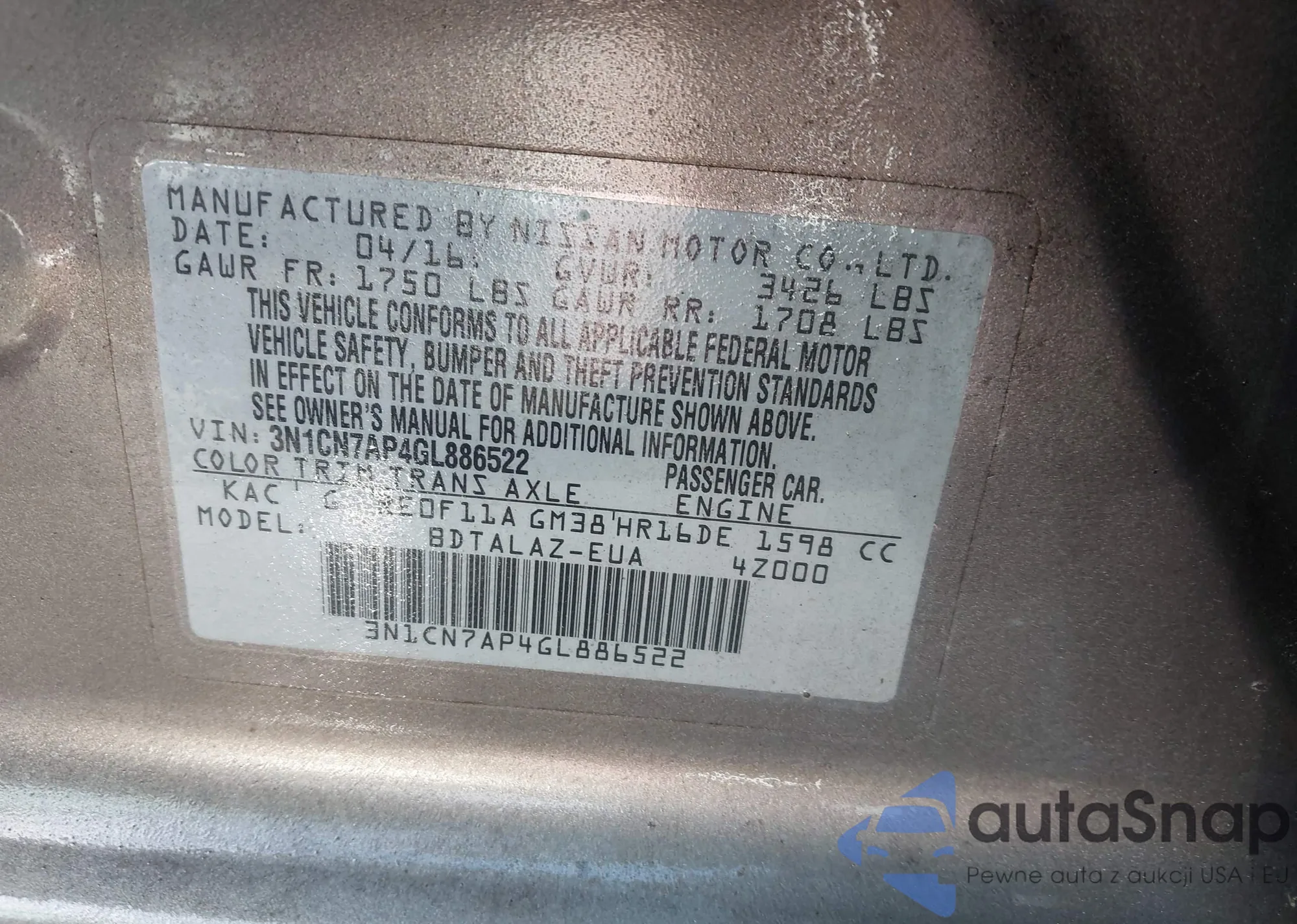 LOT: 42162499 VIN: 3N1AB8CVXLY298803