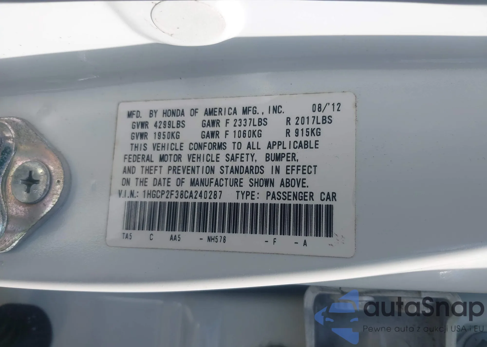 LOT: 42207870 VIN: 1HGCM72327A015512