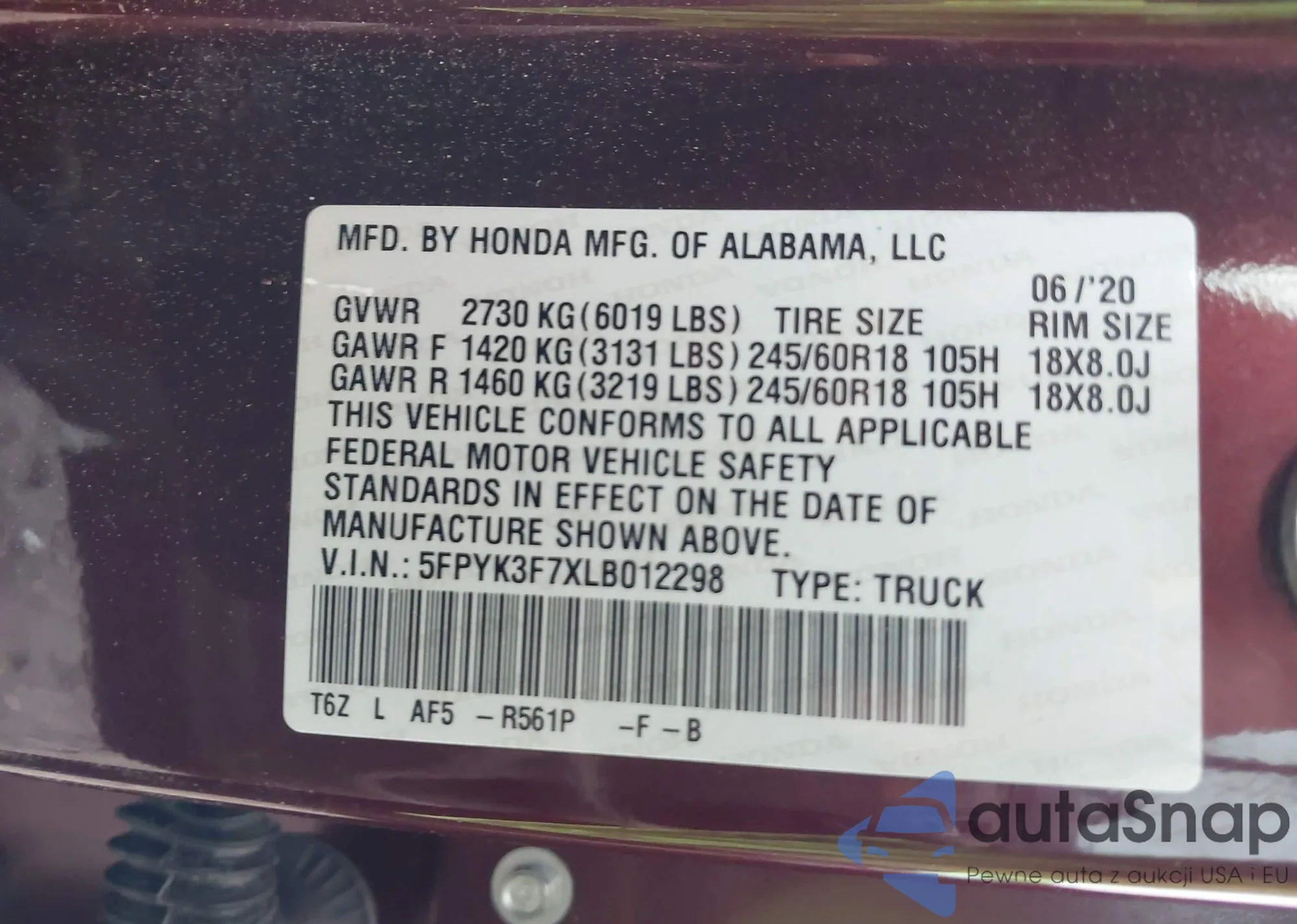 • VIN 5FPYK3F7XLB012298