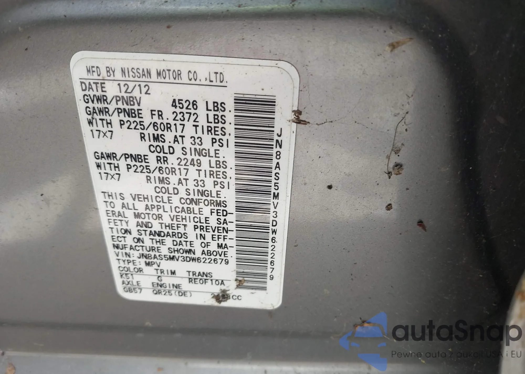 LOT: 42248572 VIN: JN8AS5MV3DW622679