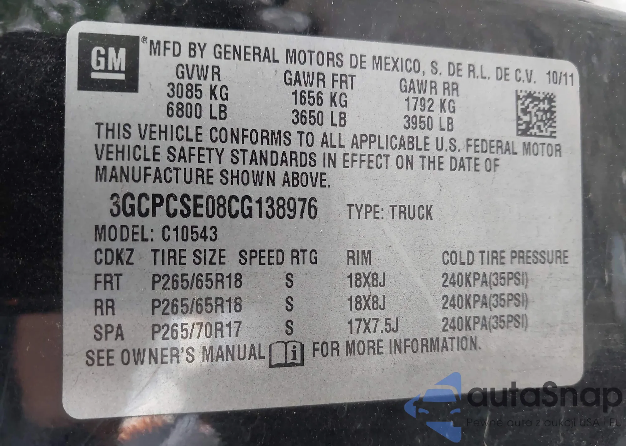 • VIN 3GCPCSE08CG138976