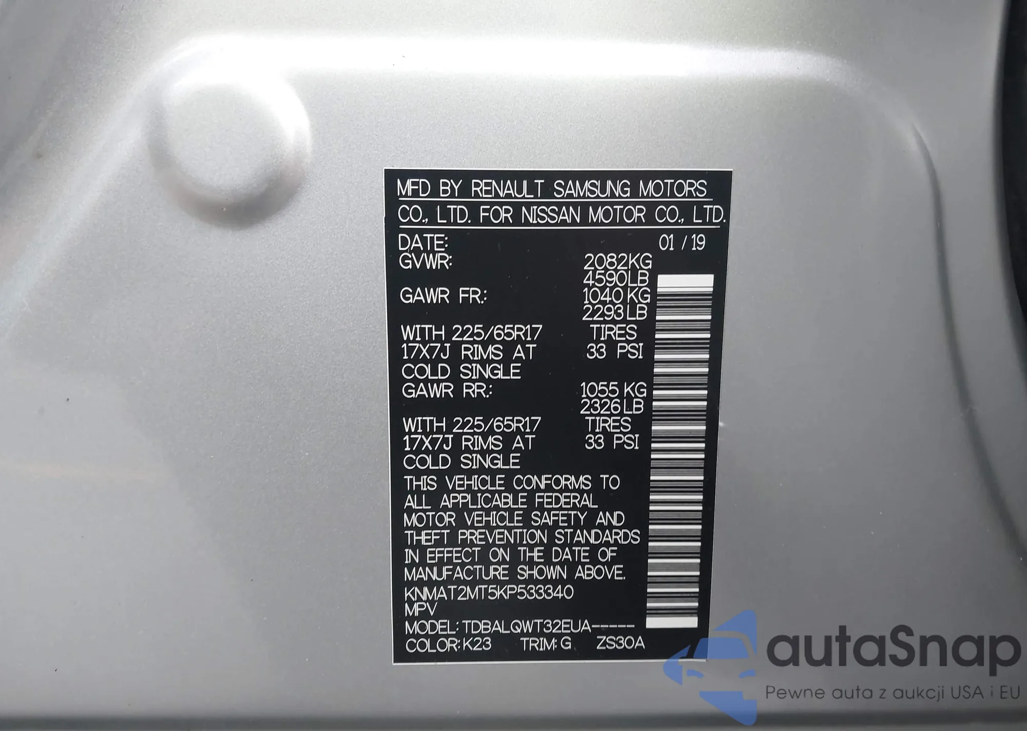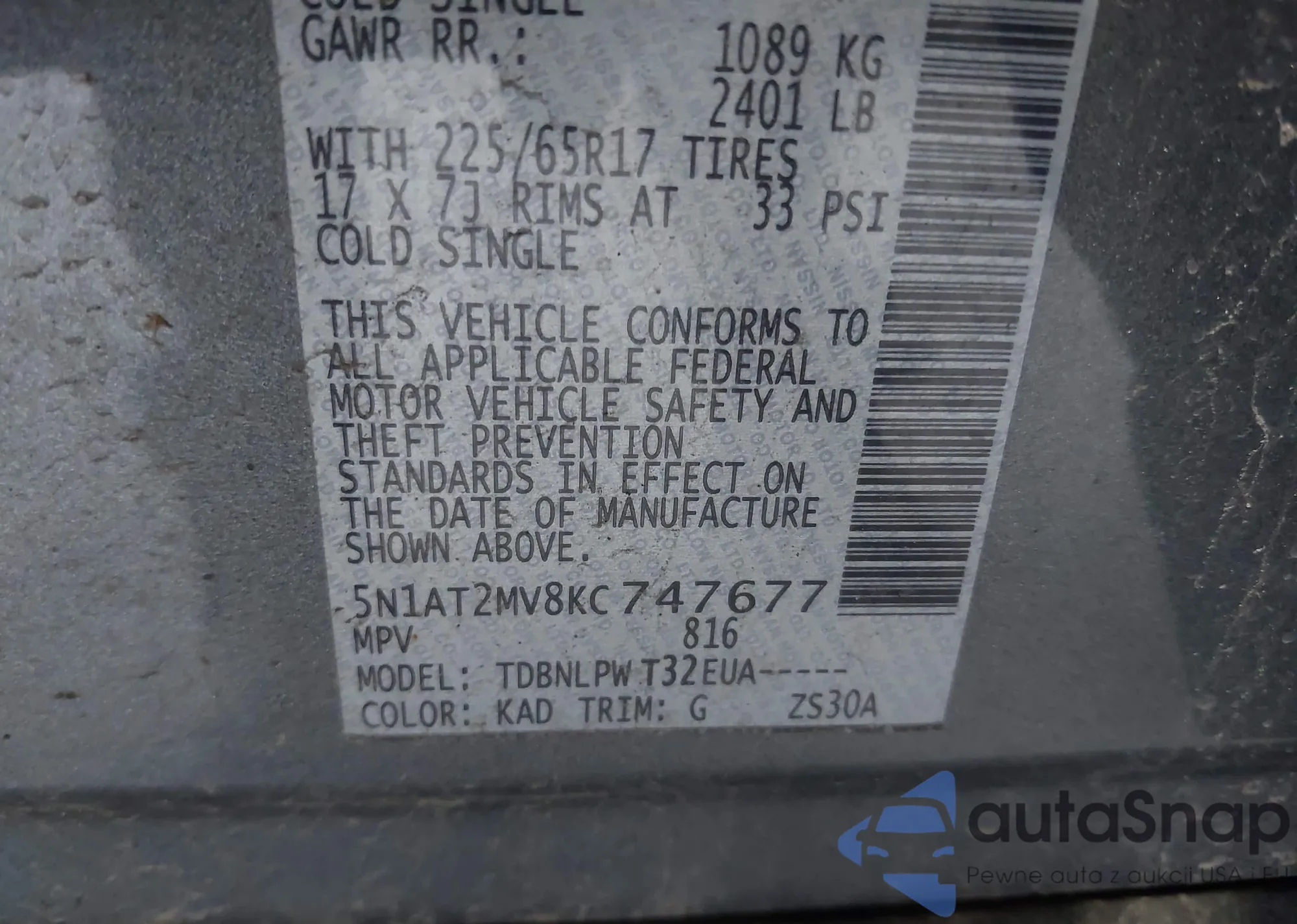 LOT: 42119117 VIN: 5N1AT2MV8KC747677