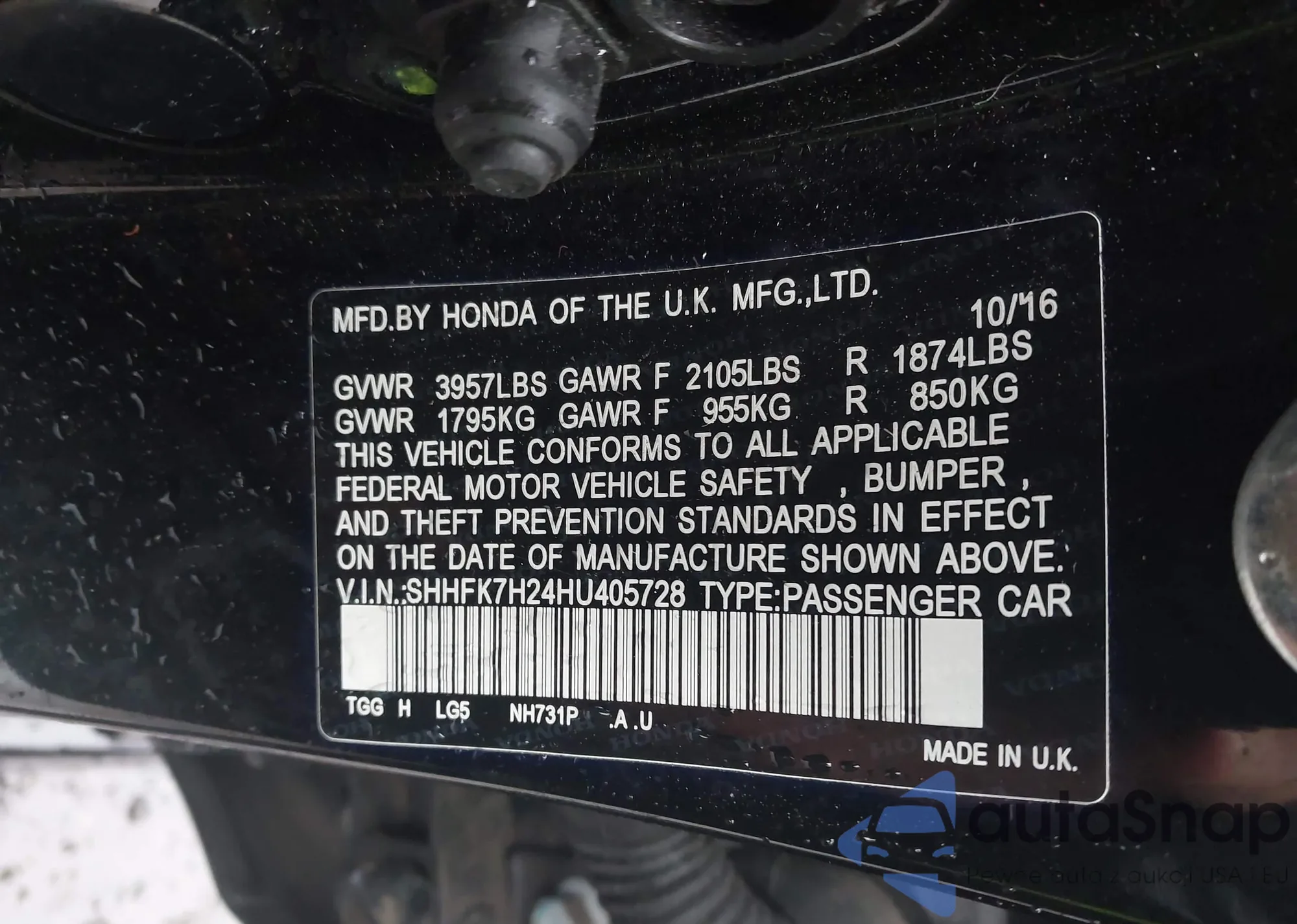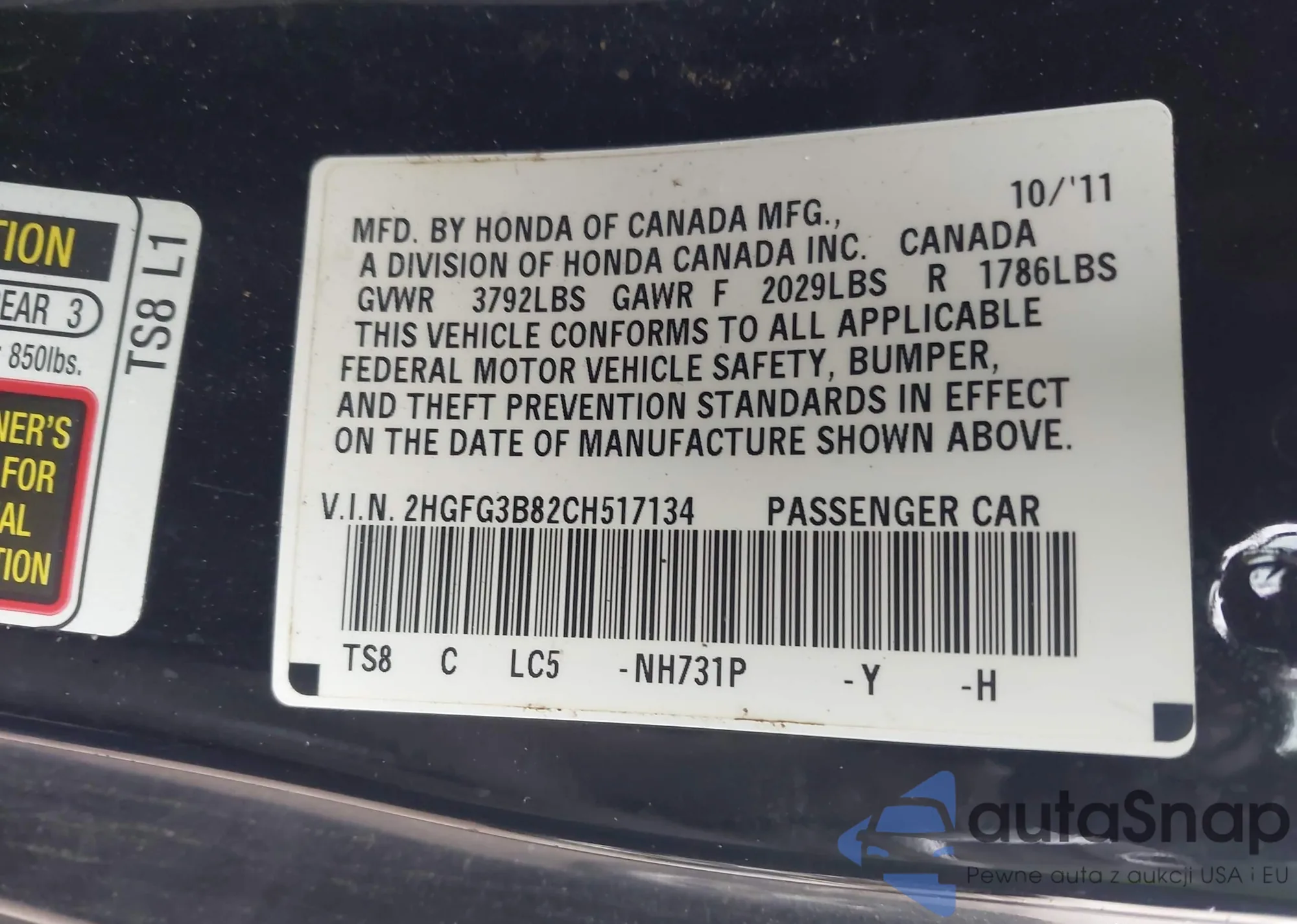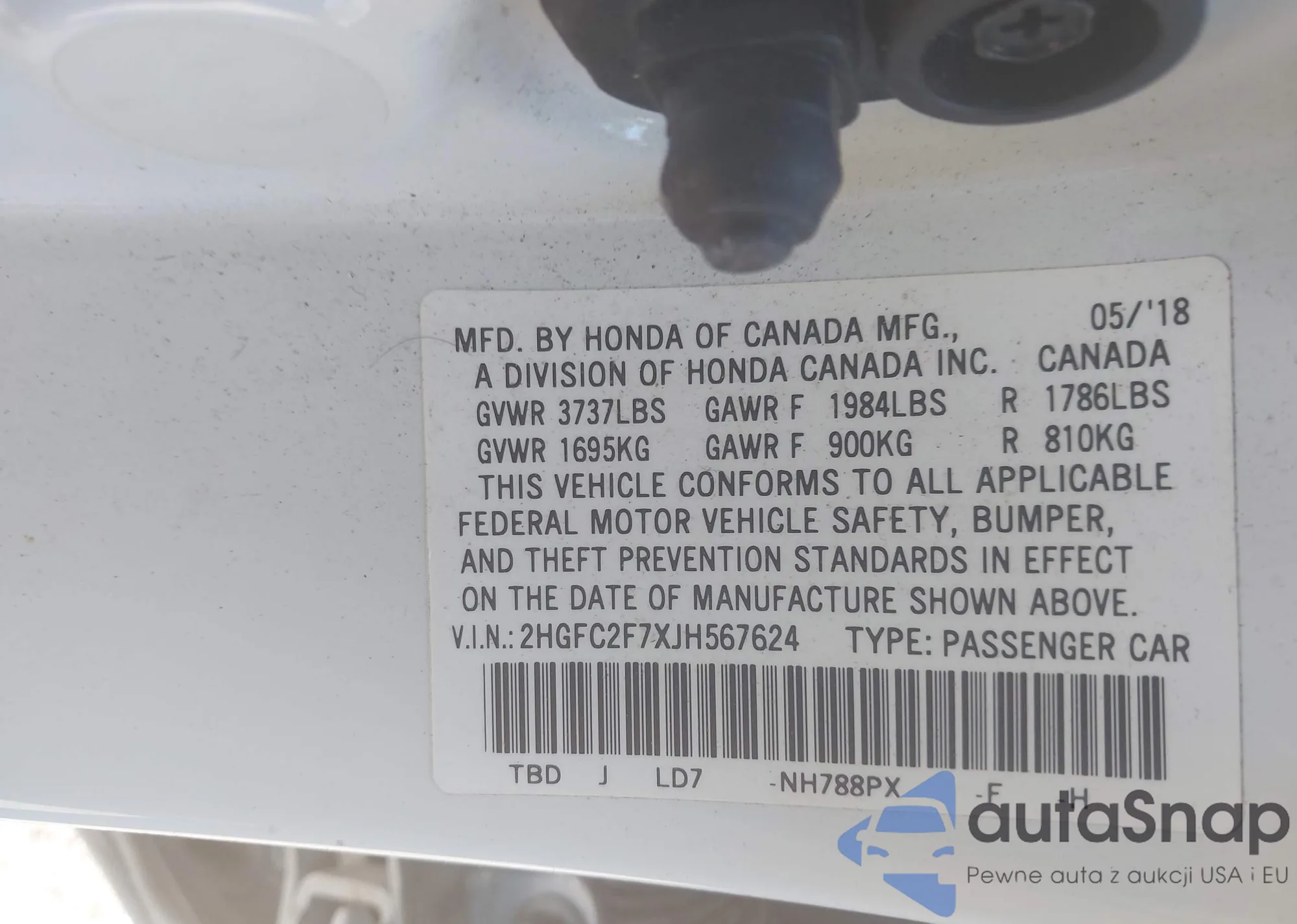 LOT: 42287708 VIN: 2HGFC2F7XJH567624