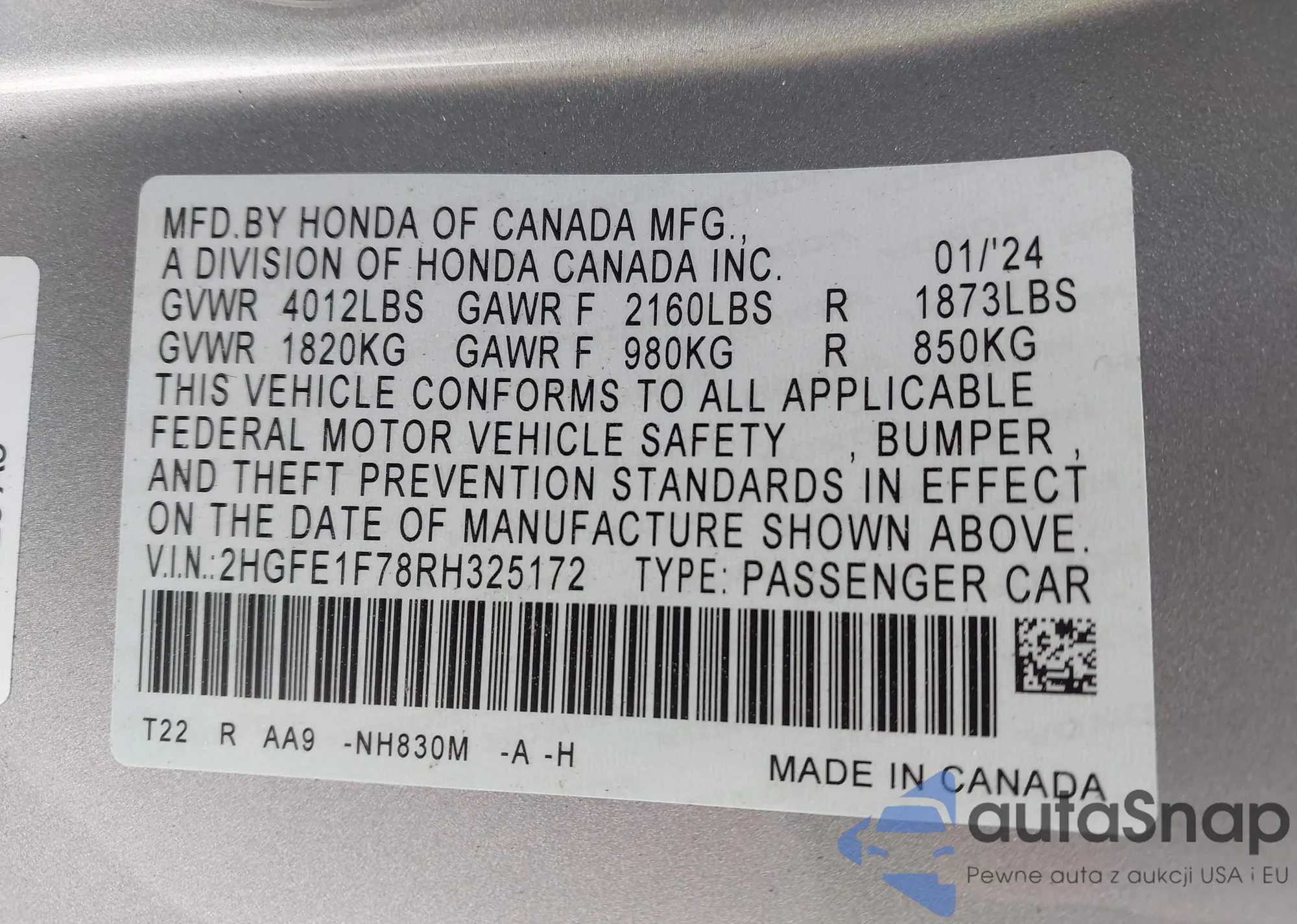 LOT: 41991741 VIN: 2HGFE1F78RH325172