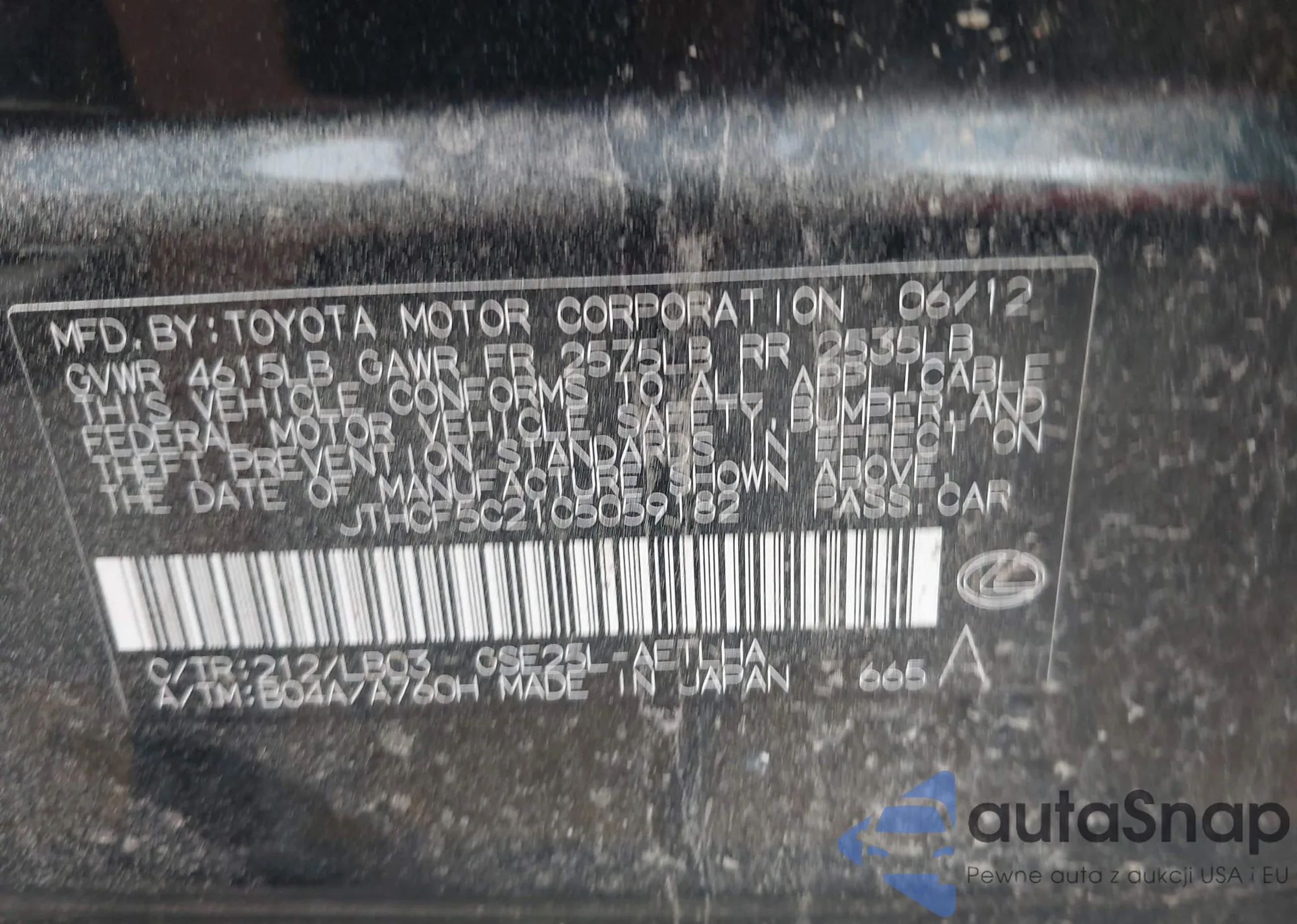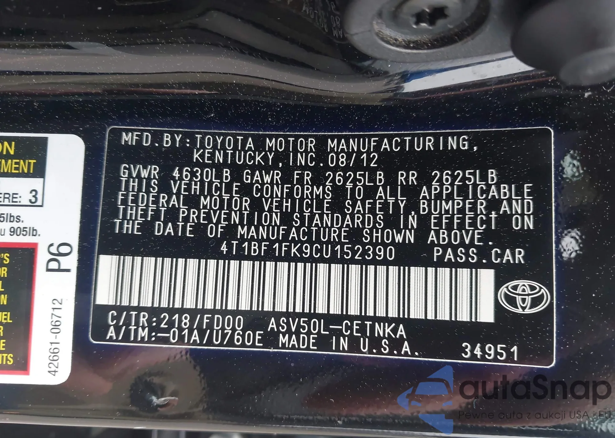LOT: 42351034 VIN: 4T1BF1FK9CU152390