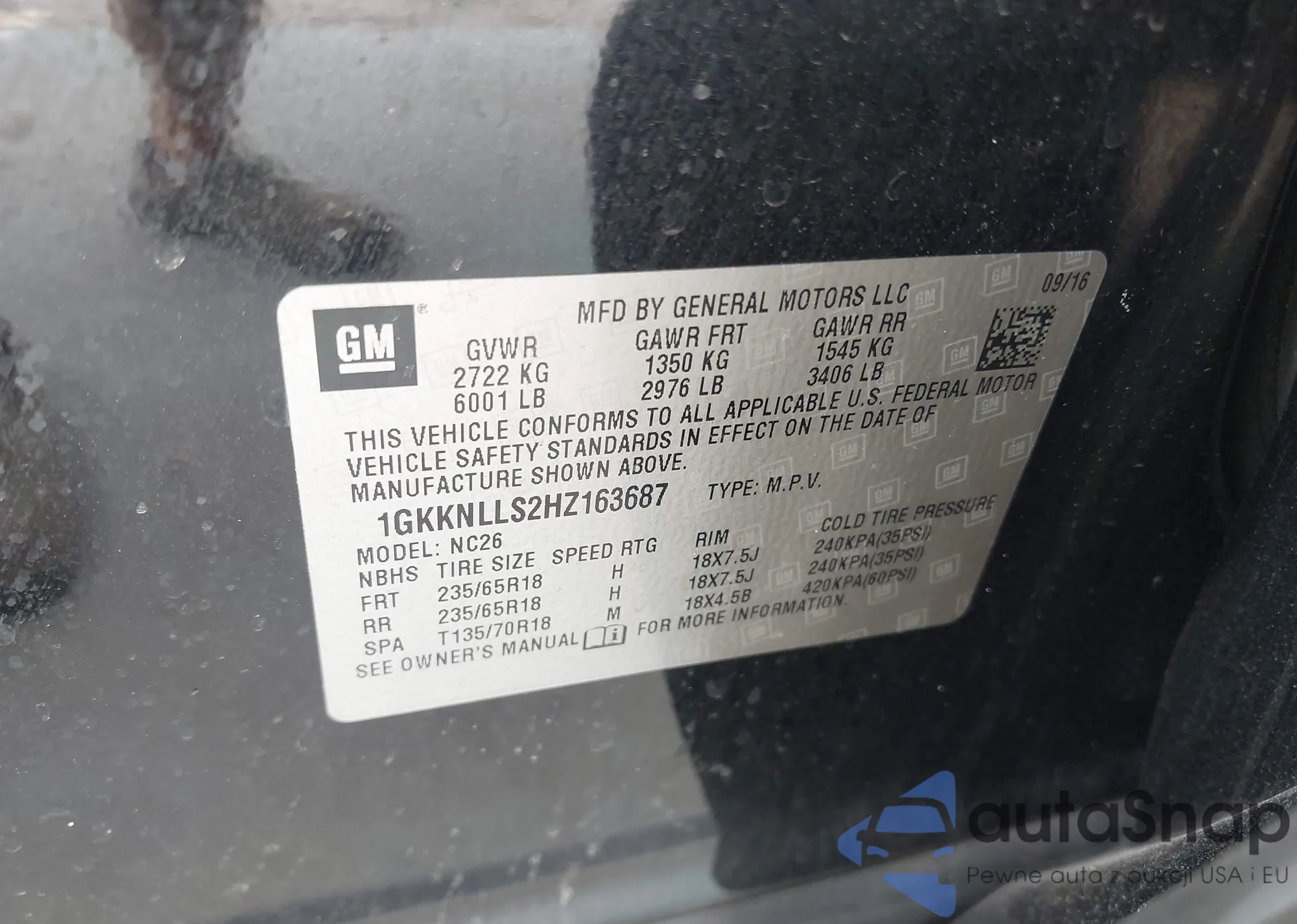 LOT: 42215323 VIN: 1GKKNLLS2HZ163687