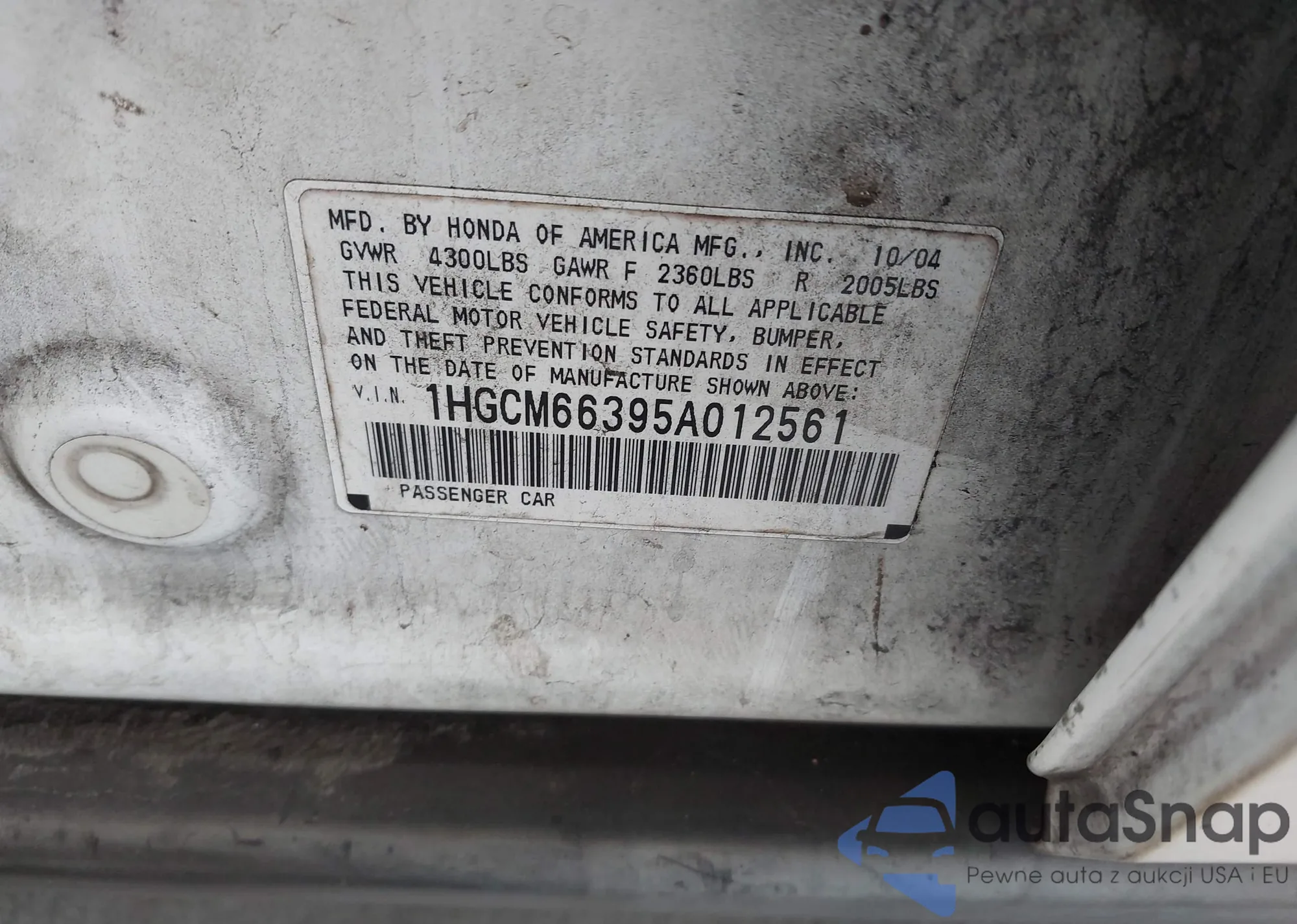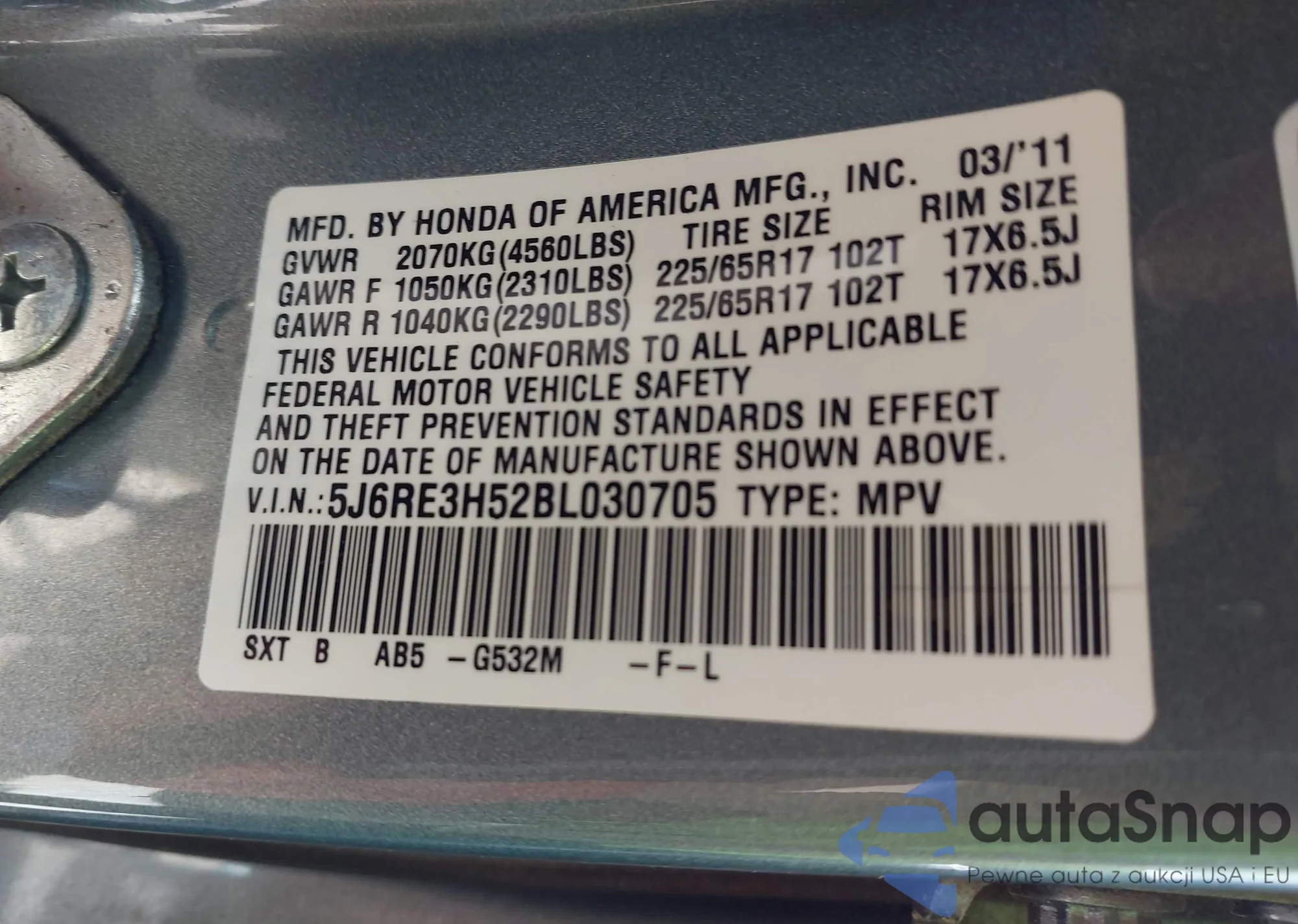 • VIN 5J6RE3H52BL030705