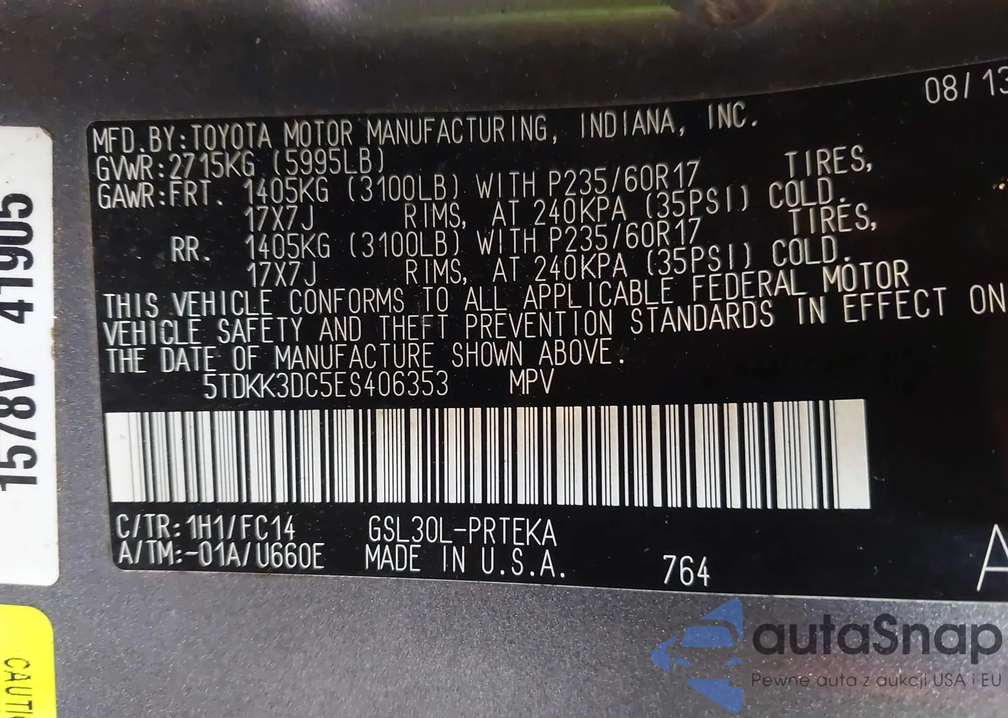 LOT: 42310092 VIN: 5TDKK3DC5ES406353