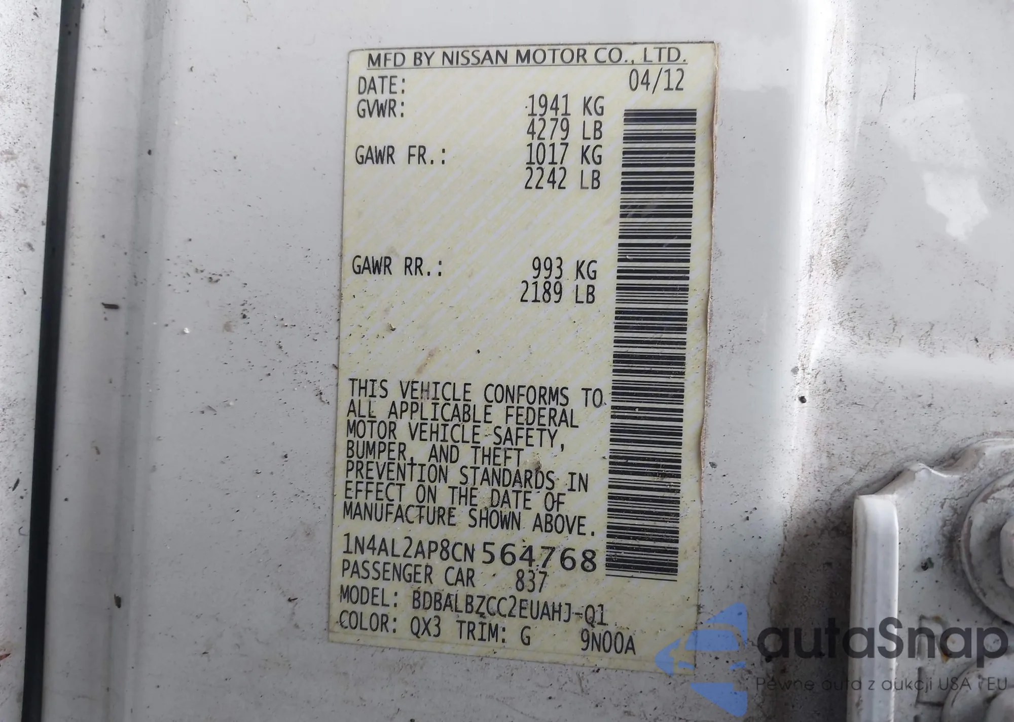 LOT: 42323125 VIN: 1N4AL2AP8CN564768