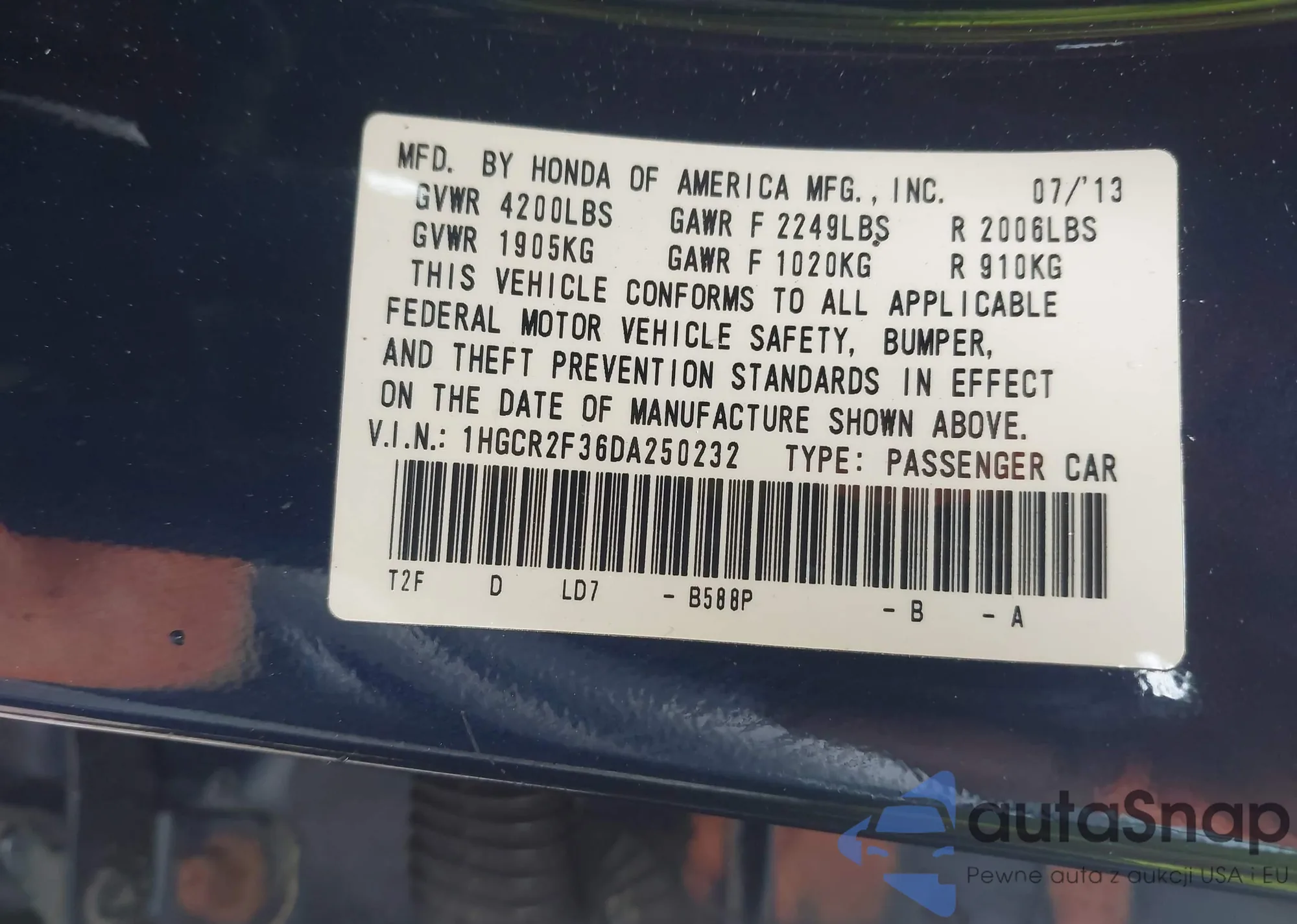 LOT: 42355539 VIN: 1HGCR2F36DA250232