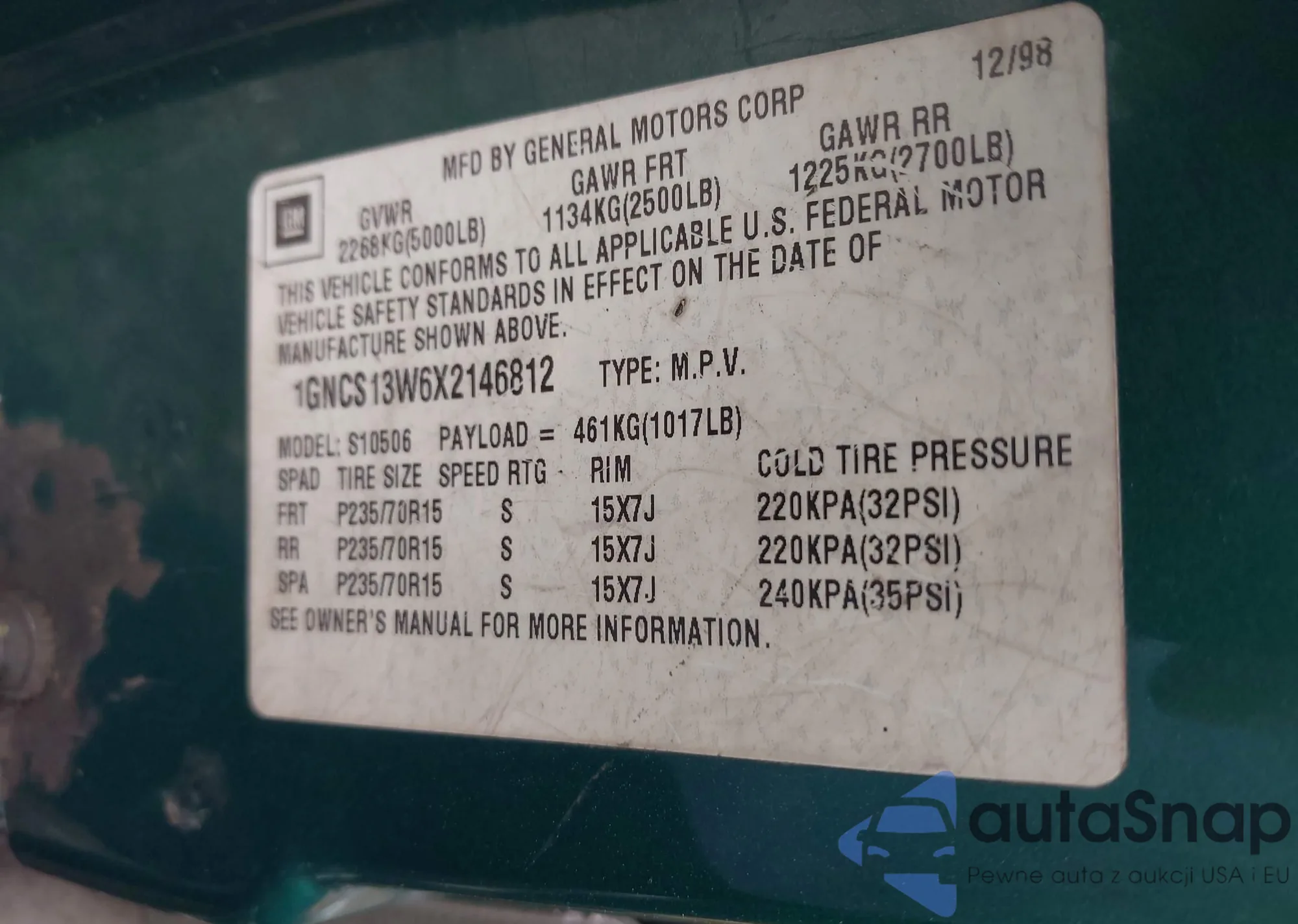 • VIN 1GNCS13W6X2146812