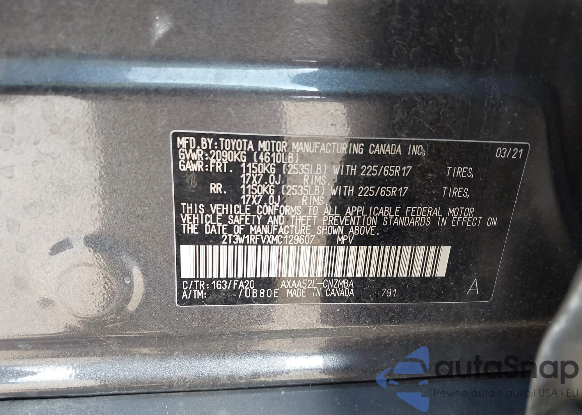 LOT: 42441926 VIN: 2T3W1RFVXMC129607
