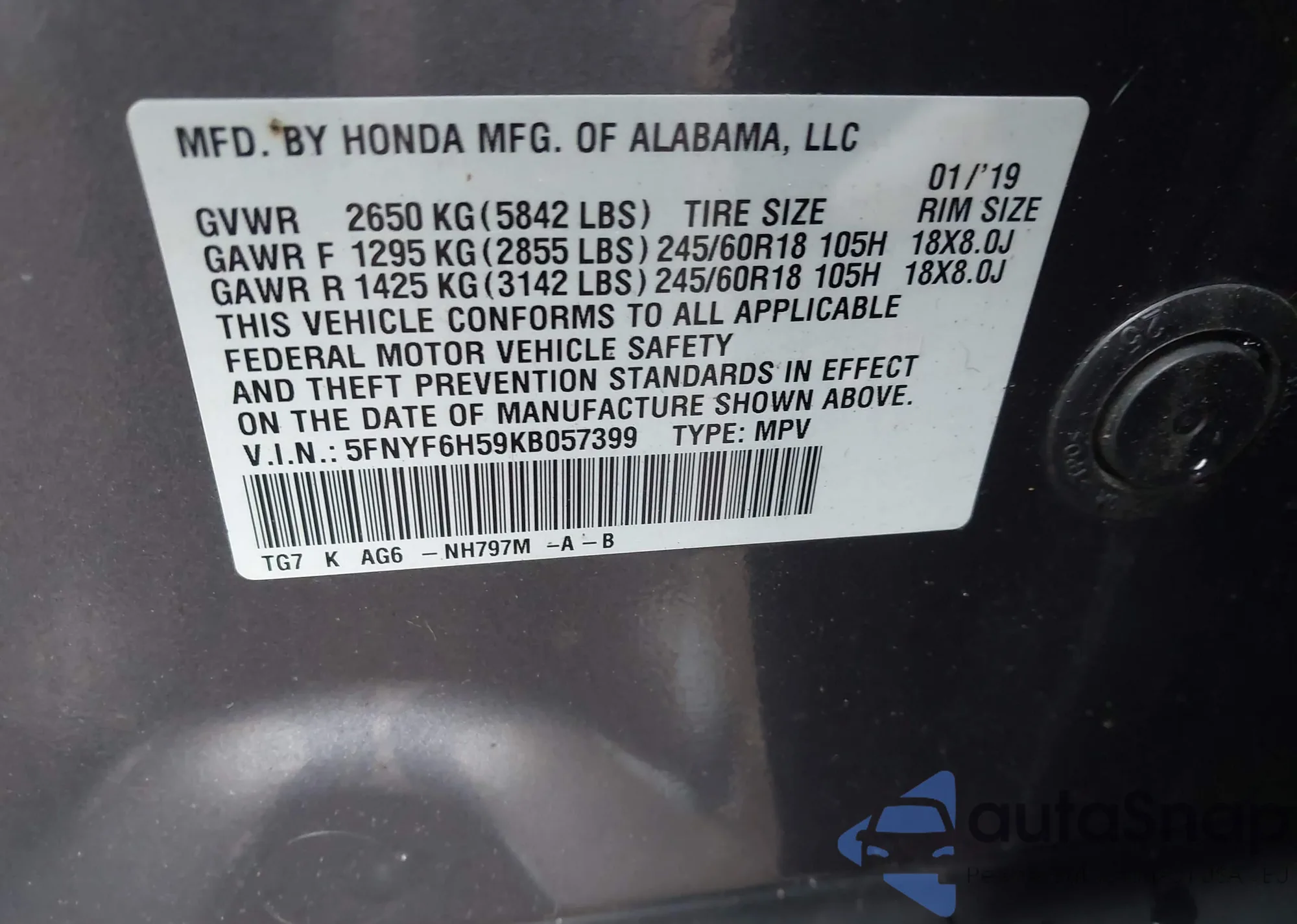 LOT: 42437948 VIN: 5FNYF6H59KB057399