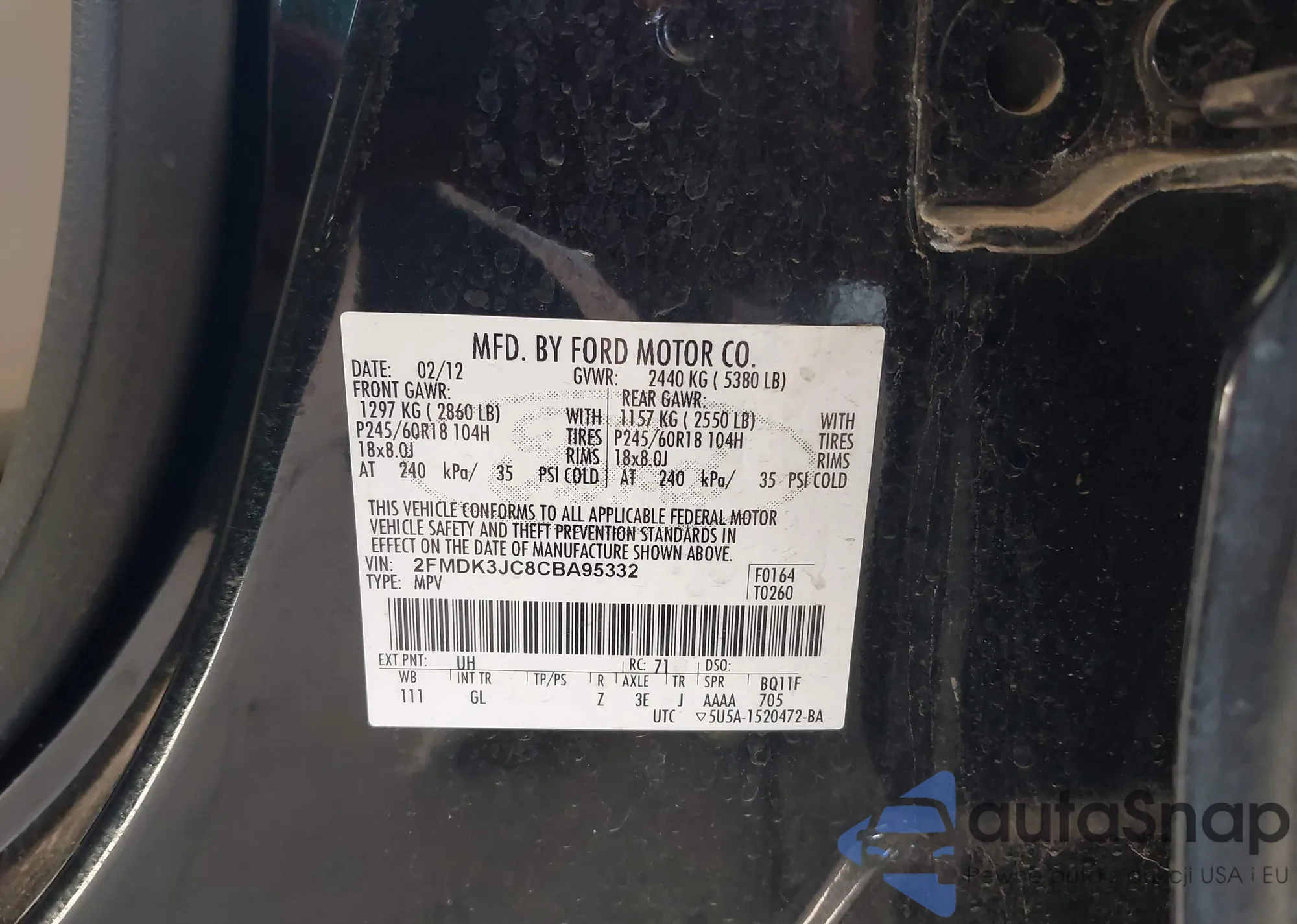 LOT: 42456013 VIN: 2FMDK3JC8CBA95332