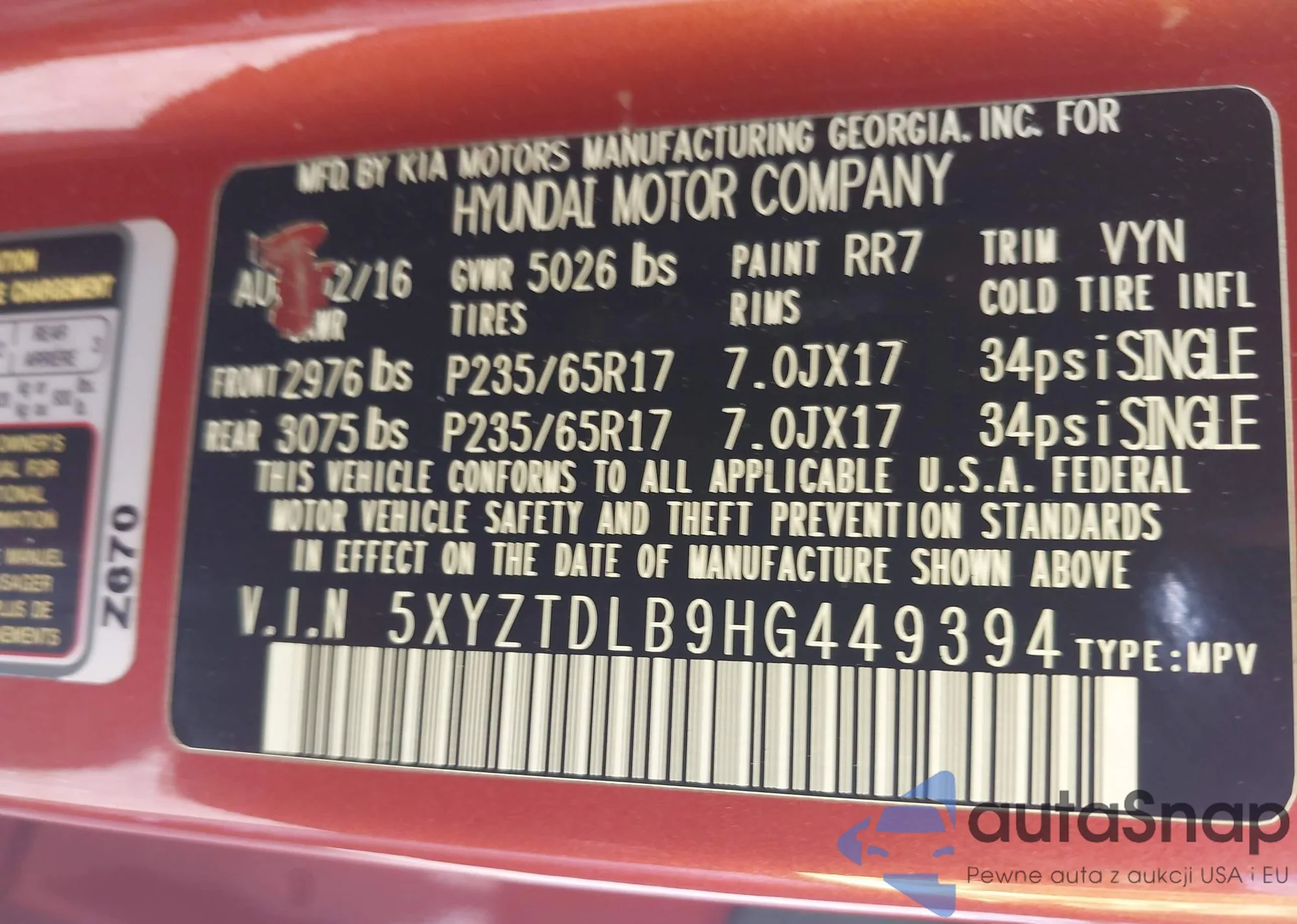 • VIN 5XYZTDLB9HG449394