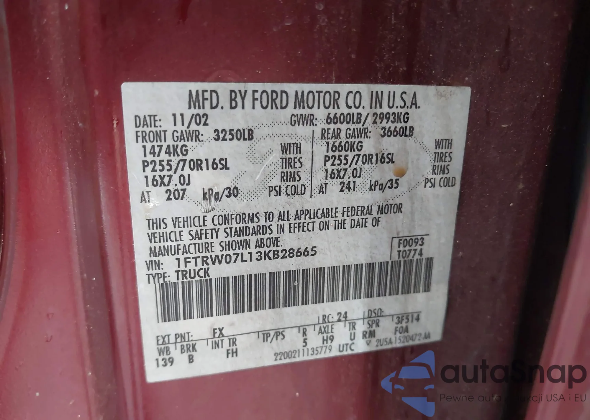 • VIN 1FTRW07L13KB28665